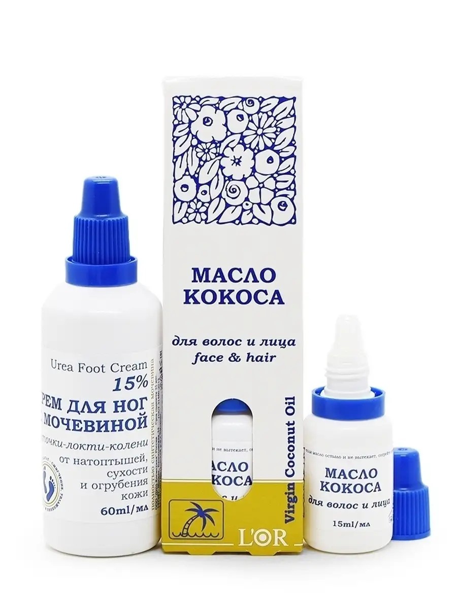 | Комплектация | кокосовое масло для лица, для тела, для волос для ногтей и кутикулы, для рук - 1 шт; крем для ног крем с мочевиной 15% от сухости и трещин, для пяток, для локтей и коленей - 1шт 60мл |