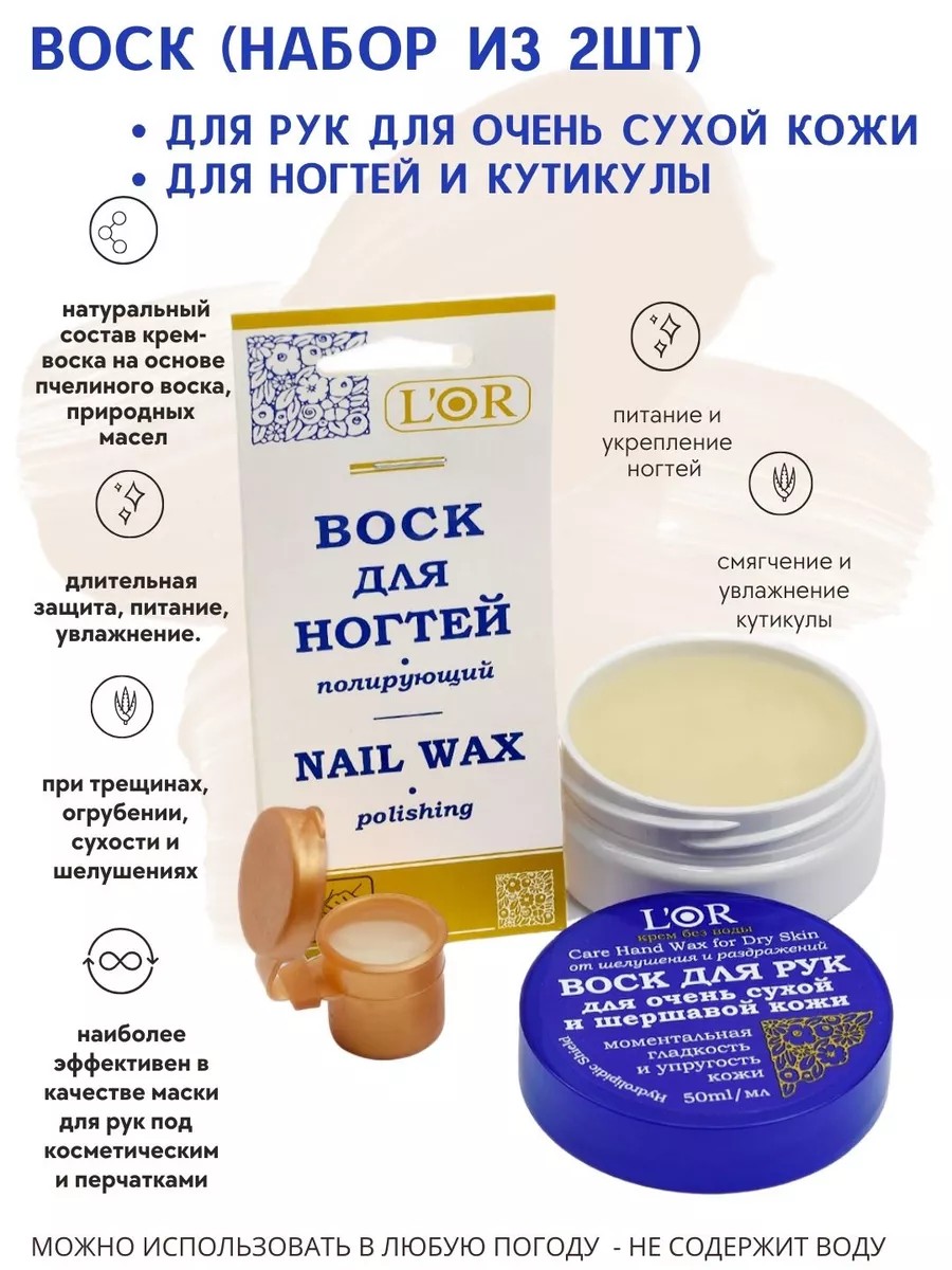 В наборе Воск для ногтей 5мл и Воск для рук для очень сухой и шершавой кожи 50 мл. Плотный натуральный воск - отличный помощник в уходе за сухой и шершавой кожей рук, за ногтями и кутикулой. Продукция набора не содержит минеральных масел консервантов красителей и отдушек. Действует сразу и очень эффективно при самых сложных повреждениях кожи - трещинах, огрубении, сухости и шелушениях. Содержит только активно действующие натуральные компоненты. Идеально защитит кожу в самых тяжелых условиях. Не содержит воды и может быть использован при любых температурах. Эффективное увлажнение. Максимальное питание. Хорошо работает в качестве ночного ухода в паре с косметическими перчатками. Эффективно устраняет микротрещины и активизирует регенерацию кожи, делая ее мягкой и нежной. Кожа рук не имеет сальных желез и страдает от сухости в большей мере, чем другие части тела. Воск и масла создают гидролипидный щит, быстро восстанавливающий водный баланс, эластичность и гладкость кожи. Нанесите на кожу и ногти, слегка вмассируйте. Воск для ногтей Полирующий - питание уход. Воск создает защиту. Масла питают ногти, способствуют смягчению кутикул и заживлению ранок вокруг ногтей. Белая глина - один из самых нежных природных абразивов. Смывать не нужно. Подходит для процедуры запечатывания ногтей.