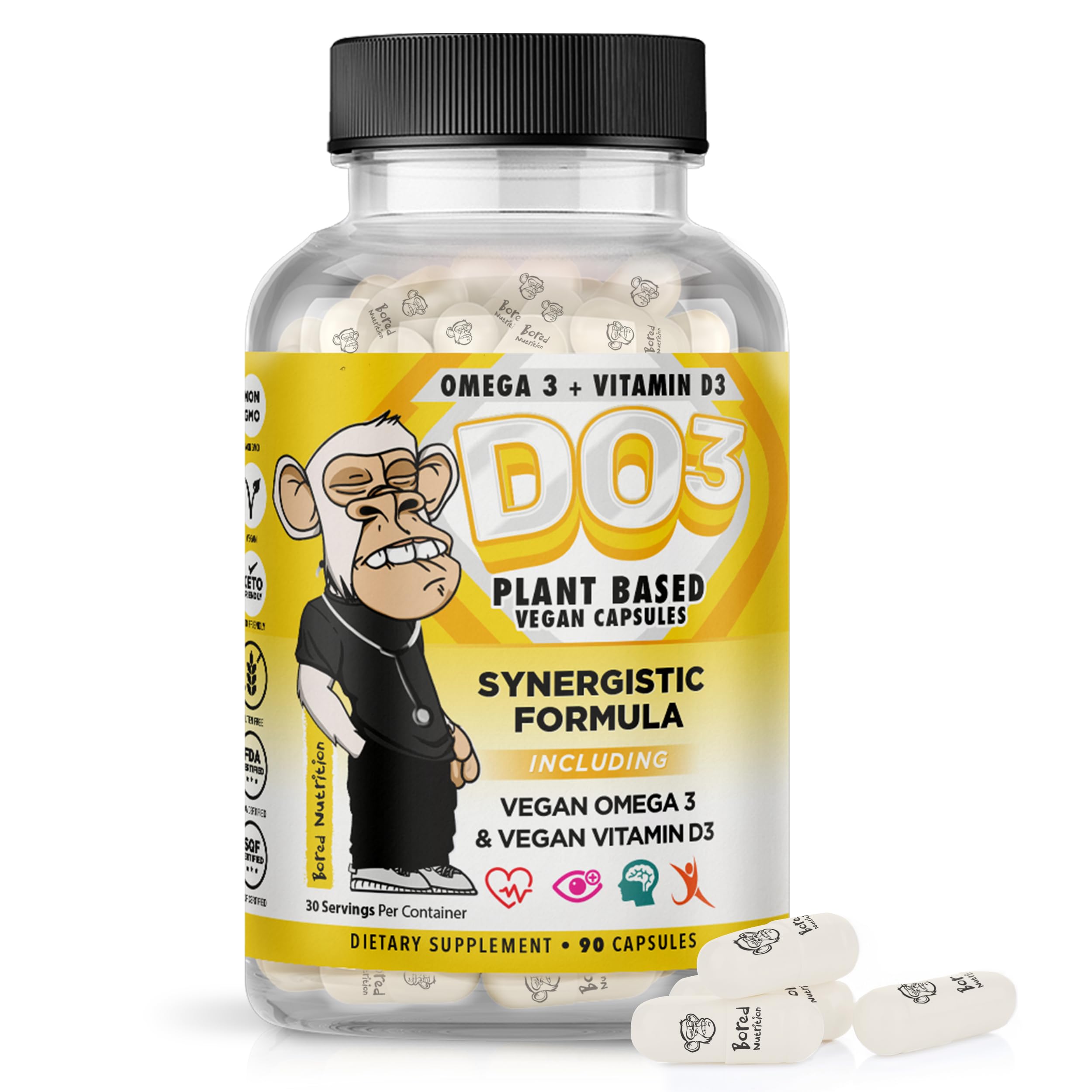HIGH IN FATTY ACIDS: Bored Nutrition's Vegan DO3 - Omega 3 D3 supplements stands out for its premium quality. Sourced directly from algae, the original source of Omega 3 which ensures a potent concentration of Omega 3 fatty acids. Unlike fish oils our omega 3 epa dha is free from common ocean contaminants, ensuring purity and safety. Dive into a cleaner, healthier alternative today. QUALITY INGREDIENTS, YOUR BODY DESERVES: we prioritize the use of premium raw materials, ensuring the purity and potency that your body deserves. The majority of our products are crafted with non-GMO ingredients, are gluten-free, and proudly manufactured in the USA. Rest assured, a Certificate of Analysis is provided for every product we produce, reaffirming our commitment to transparency and quality. Bored Nutrition features Bored Apes Dr.Ape and is part of the Made by Apes Community License 00359. SUSTAINABLY SOURCED: Each serving of our Omega-3s comes from Algae and contains a premium blend of 900 mg EPA, 700 mg DPA, and 125mcg Vitamin D3 creating a 2-1 formula. EASY TO SWALLOW CAPSULES: Plant based Omega 3 with Vitamin D3 is easy to swallow and taste-less, so taking algae supplements every day just a little bit easier. If you have a sensitivity to swallowing pills, our small size capsule will be perfect for you. One serving is 3 capsules. VEGAN FRIENDLY: This Omega with D3 supplement offers a compassionate alternative bypassing the need to disturb marine life. Bid farewell to concerns about fish harvesting if you're vegan. By sourcing directly from the Omega 3-rich algae, we've ensured a guilt-free solution that aligns perfectly with ethical choices. 2-IN-1 SUPPLEMENT: When combined, Omega 3 and Vitamin D3 are an essential duo. Vitamin D3 helps your body absorb calcium, while Vegan Omega 3 contains essential fatty acids EPA DHA - which may help support health. .