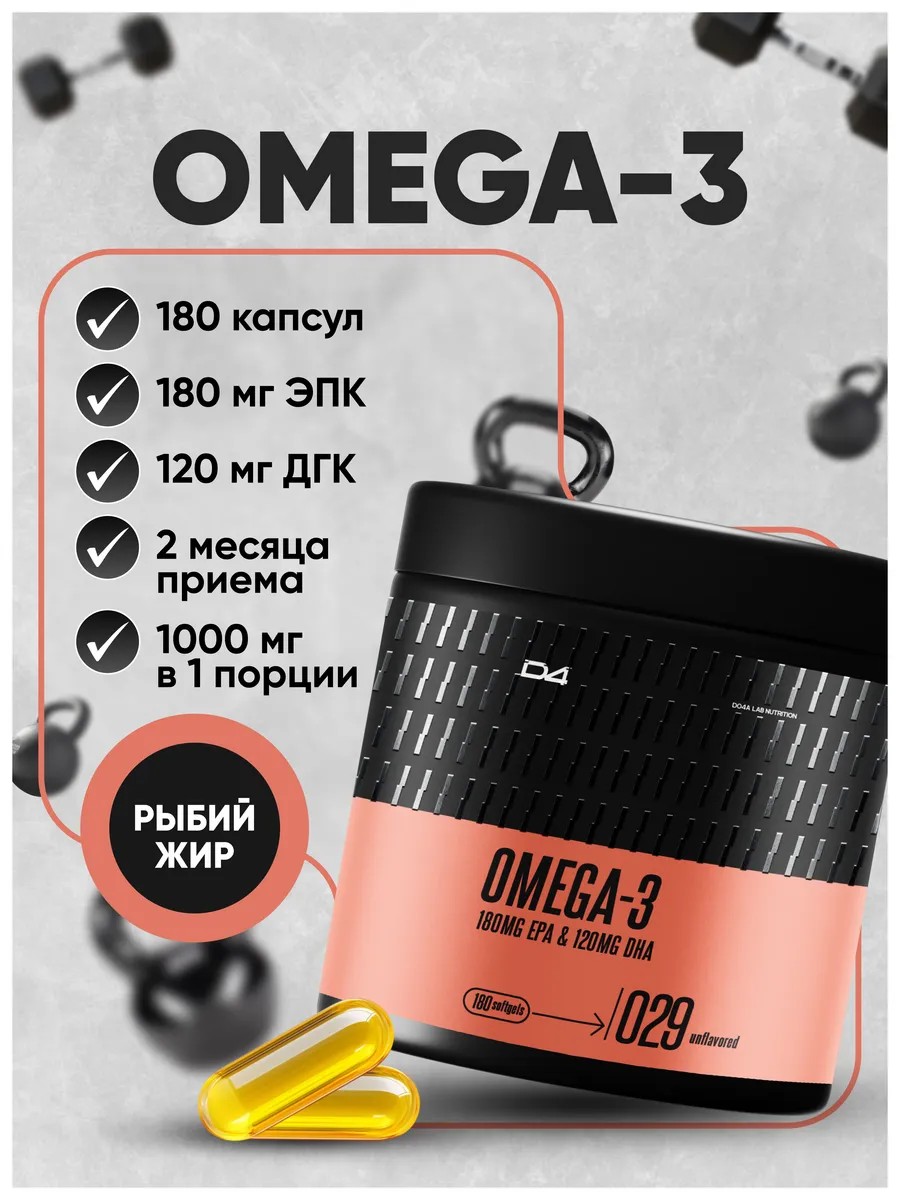 Омега 3 бренда Do4a Lab отличается оптимальной концентрацией активных компонентов (300 мг) и оказывает комплексное действие на женский и мужской организм. Он создан по уникальной формуле, в которой содержится не только натуральный рыбий жир, богатый витамином d3, но и эйкозапентаеновая, докозагексаеновая кислота. БАД способствует укреплению сердца и сосудов, восстановлению красоты и здоровья. Omega 3 обеспечивает улучшение состояния кожи лица и тела, укрепление суставов и костей. Биологически активная добавка предотвращает выпадение волос и стимулирует их рост, повышает густоту и уменьшает ломкость. Входящие в ее состав вещества крайне важны для связок и контроля массы тела. Витаминный препарат российского производства насыщает энергией и очень полезен для нервов. Он положительно отражается на состоянии нервной системы взрослых женщин и мужчин, пожилых людей и девушек, парней - подростков, помогает противостоять стрессам. Средство также стимулирует деятельность головного мозга. Оно отлично дополняет сбалансированное спортивное питание, снижает уровень холестерина в крови и предотвращает появление морщин. Пищевая добавка является богатым источником питательных веществ, необходимых для спортсменов. Она улучшает память, способствует снижению жировых запасов и уменьшению вязкости крови. Продукт оказывает антиоксидантное действие, обеспечивает защиту от болезней и устраняет усталость. Он нормализует обменные процессы, создан на основе компонентов высокого качества. Применение средства следует осуществлять строго по инструкции, не превышая рекомендованные дозировки. Пить препарат рекомендуется во время или после приема пищи для максимального усвоения. Достаточно при этом принимать по 1 капсуле трижды в день. Хранить БАД следует в защищенном от прямых солнечных лучей месте. Соблюдая все эти рекомендации, он принесет исключительно пользу и при этом окажет выраженный эффект. Продукция выпускается в удобной баночке в форме желатиновых капсул для приема внутрь. В новой коллекции бренда Do4a Lab представлены упаковки по 90 и 180 штук. Биодобавка предназначена для взрослых людей. Ребенку школьнику и детям младшего возраста рекомендуется выбрать средство, соответствующее их возрастной категории. У нас есть акции и распродажи, вы можете купить наши товары в подарок со скидкой!