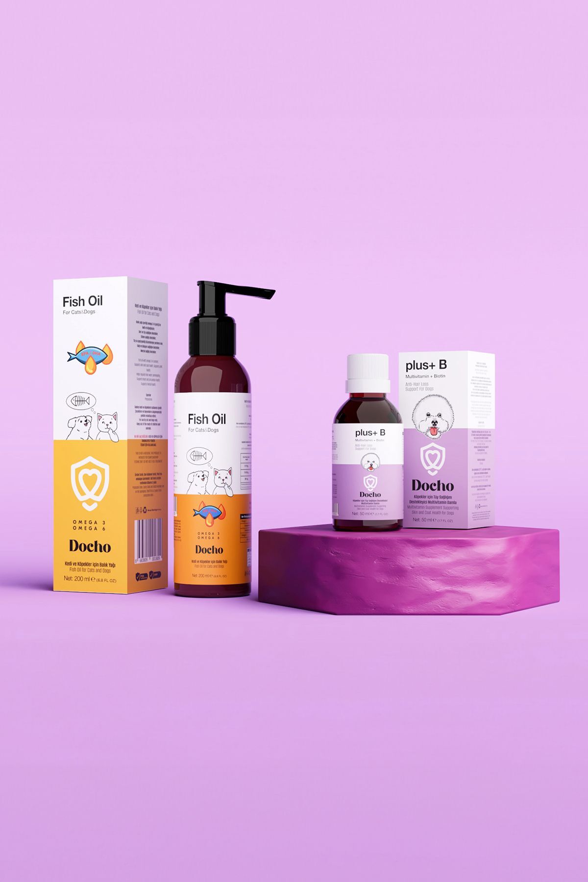 Kedi ve köpekler için balik yagi, genellikle sivi veya kapsül formunda bulunur.Sivi formda olan docho balik yagi, mamanin üzerine damlatilip karistirilarak verilebilir.Etkli sonuç almak için düzenli kullanim önemlidir