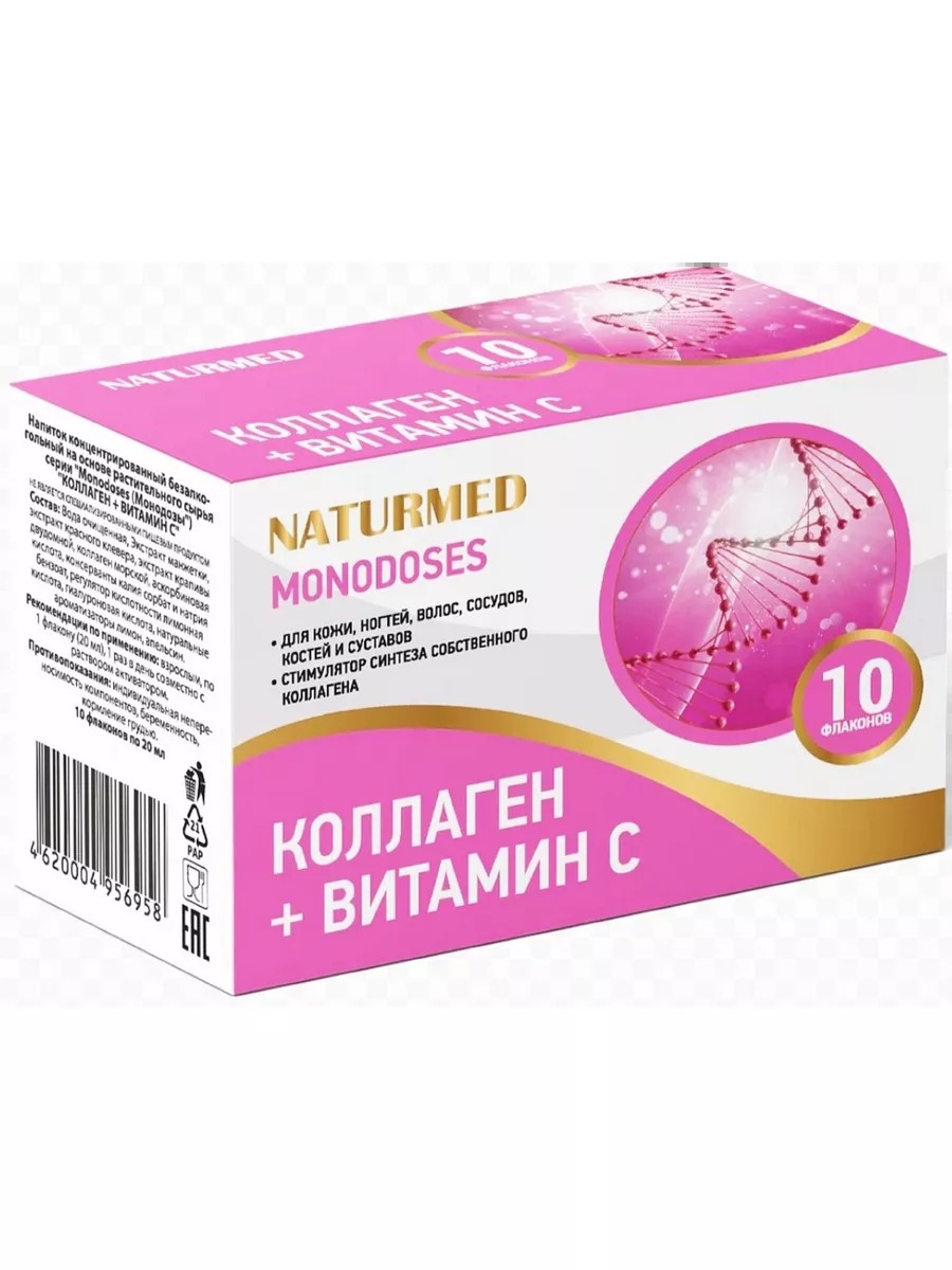 NATURMED MONODOSES Collagen with Vitamin C is a complex of vitamins, minerals, and plant components that help optimize metabolic processes aimed at maintaining the health and beauty of the skin, nails, and hair. One of the important links is collagen, a structural protein that makes up the main framework of our body's connective tissues. For better absorption, collagen is hydrolyzed and broken down into peptides - smaller protein molecules (amino acids). Collagen peptide is the main protein of connective tissue, responsible for its strength. Convenient administration: just 1 bottle 1 time per day together with the Activator solution (article WB 190734704). Created especially for you. Dr. Arsenin.