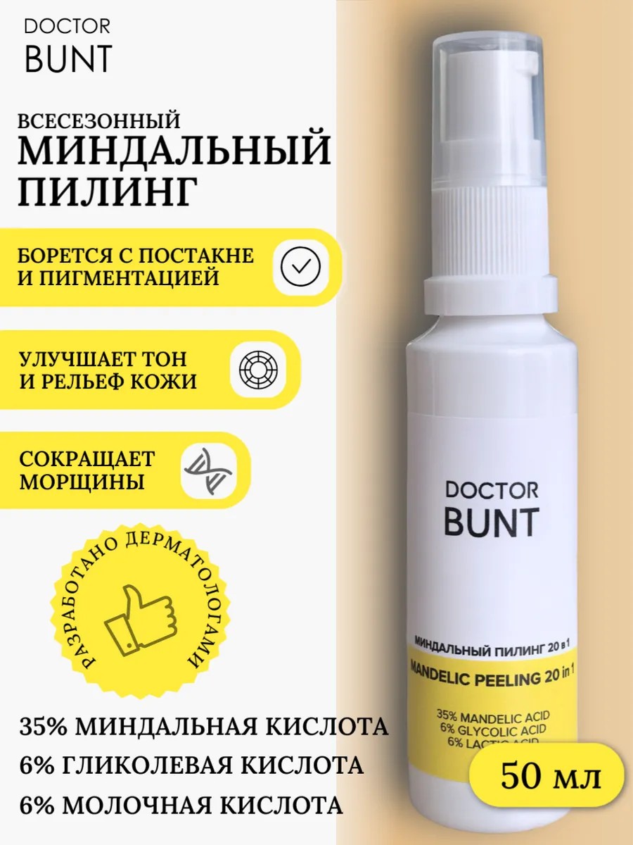 Миндальный пилинг для лица от DOCTOR BUNT – вашим верным помощником в борьбе за сияющую кожу! Этот кислотный пилинг для лица бережно очищает, обновляет и выравнивает тон кожи, делая ее гладкой и бархатистой. Миндальная кислота в составе пилинга эффективно борется с прыщами и акне, а также разглаживает морщинки, возвращая коже молодость и свежесть. Пилинг подходит для лица, шеи и декольте, а также для ухода за нежной кожей рук. Благодаря своей мягкой формуле, он подходит для всех типов кожи, даже чувствительной. Регулярное использование миндального пилинга DOCTOR BUNT подарит вам ощущение комфорта и уверенности в своей красоте.
