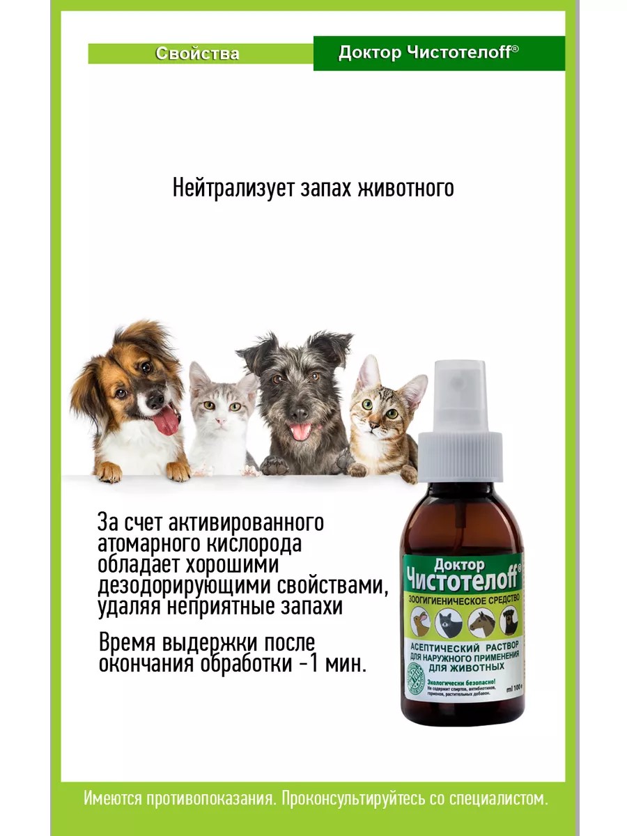 Средство по уходу за животным Доктор Чистотелоff для обработки лап, ушей, морды, наружных половых органов, копыт, вымени, молочных желез. Гипохлорная кислота, основной компонент средства, обладает асептической активностью при наружном применении против вирусов, грибков и бактерий. За счет активированного атомарного кислорода обладает хорошими дезодорирующими свойствами, удаляя неприятные запахи. Не содержит растительных ингредиентов, антибиотиков, гормонов. Не является лекарственным средством.