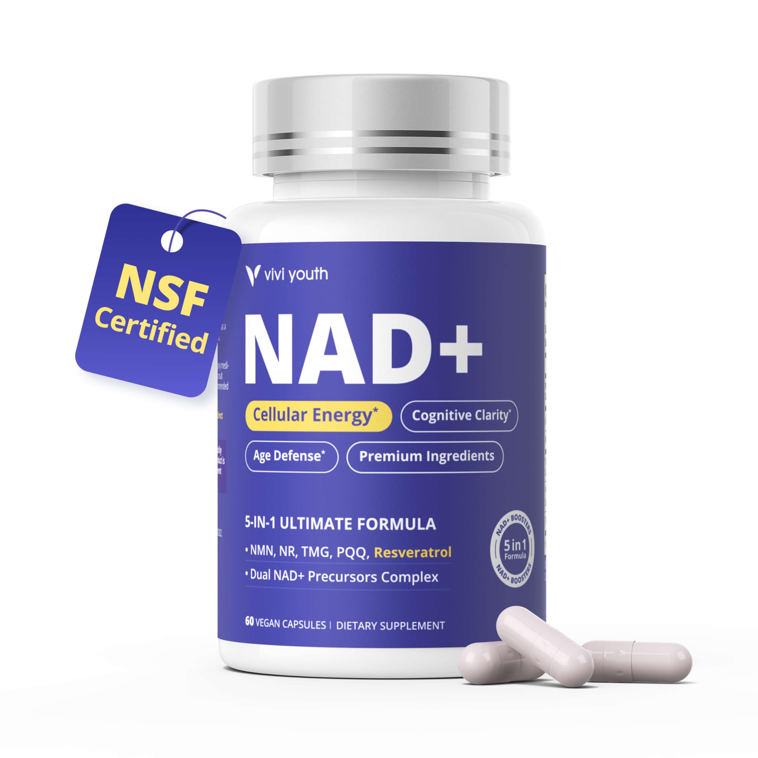 PURE HIGH-POTENCY FORMULA, NO FILLERS – Made in a GMP-certified, third-party tested facility. Non-GMO, vegan and gluten-free. Contains only active ingredients for maximum absorption and efficacy. CARDIOVASCULAR MUSCLE HEALTH FORMULA – Targets NAD pathways in cardiomyocytes and skeletal muscles to improve circulation, support muscle recovery and promote long-term heart health and endurance. BOOSTS ENERGY, FOCUS COGNITIVE PERFORMANCE – Increases ATP production to combat fatigue, enhance mental clarity and support sustained focus and productivity throughout the day. CELLULAR LONGEVITY DNA REPAIR SUPPORT – Helps activate sirtuins and enhance mitochondrial efficiency to promote DNA repair, reduce cellular damage and slow age-related decline at the source. CLINICAL-GRADE NAD ACTIVATION – Developed with advanced longevity science, this multi-pathway formula combines NMN, NR, Resveratrol, PQQ and Betaine to maximize cellular NAD production in the heart, brain and muscle tissues for superior anti-aging benefits.