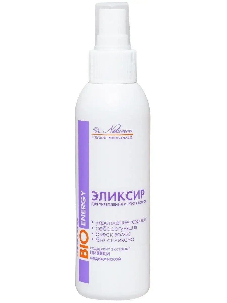 Эликсир придает волосам естественный блеск и объём, в процессе использования не создает эстетических неудобств, не утяжеляет и не зажирняет волосы.Эликсир эффективно укрепляет и восстанавливает рост новых волос, улучшает питание, возвращает жизненную силу и красоту волосам.Оригинальная формула эликсира содержит биоактивные вещества медицинской пиявки НМ1 и комплекс экстрактов кигелии, гинкго билоба, шалфея, коричного дерева, которые благодаря липосомальной структуре компонентов экстракта пиявки медицинской и растительным веществам проникают в глубокие слои кожи, нормализуют микроциркуляцию крови, воздействуют на волосяные фолликулы. Эликсир снижает секрецию кожного сала, также предупреждает гормонально зависимое выпадение волос. Проникая в слой кутикулы волоса активные вещества защищают его стержень от повреждений, способствуют уменьшению трансмиссии влаги с поверхности, а также удержанию на волосах активных компонентов эликсира, увлажняющих волосы и придающих им блеск. Способ применения: распылить небольшое количество эликсира на кожу головы по проборам (особенно на проблемные участки), затем произвести лёгкий массаж головы для лучшего распределения средства. Не смывать! Уложить волосы привычным способом. Применять 1-2 раза в день. Рекомендуется комплексный уход с использованием шампуней, и маски для укрепления и роста волос доктора Никонова. Допускается совместное применение с другими средствами для укладки.