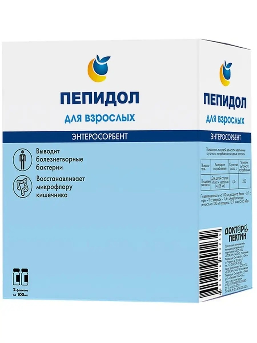 Pepidol 5% for adults - solution, liquid natural sorbent. PEPIDOL is an antibacterial enterosorbent. Its base is pectin. This is a universal preparation of plant origin. It has the ability to selectively destroy all pathogenic and opportunistic intestinal flora without damaging the normal intestinal flora. Long-term research has revealed the multifaceted effects of PEPIDOL on the human body. As a result, it was established: (1) PEPIDOL has a bactericidal effect on pathogenic bacteria, while the normal microflora is not sensitive to it. This promotes the development and colonization of beneficial microorganisms in the intestine; (2) entering the gastrointestinal tract, PEPIDOL forms gels that, moving through the intestines, capture toxic substances and protect the mucous membranes from irritation; (3) during the process of food digestion, PEPIDOL combines with toxins, heavy metal salts and radionuclides, resulting in the formation of insoluble complexes which, without being absorbed into the gastrointestinal mucosa, are excreted from the body. That is, unlike other sorbents, PEPIDOL irreversibly binds toxins, etc., completely excluding their absorption through the intestinal mucosa; (4) the protective effect of PEPIDOL is also explained by its ability to restore the function (peristalsis) of the intestine, eliminating constipation, and thereby facilitating the rapid elimination of toxins and waste. At the same time, in case of diarrhea, PEPIDOL slows down peristalsis and promotes the complete absorption of all substances necessary for the body; (5) PEPIDOL, by binding bile acids, provides a hypocholesterolemic effect. Binds allergens and toxins in the intestinal lumen, reduces intestinal wall permeability, increases the protective properties of the intestinal mucosa, and strengthens the overall immune status of the body. It is used for intestinal infections, intoxications, poisoning, constipation, dysbacteriosis, toxicosis, food allergies, to restore microflora after taking antibiotics, enteritis in oncology, to cleanse the body, during a diet, and for hangovers. It has no side effects and does not cause allergic reactions. Directions for use: For adults and children over 14 years old - every 3 hours (4-5 times a day), 1 hour before meals, 25 ml (2 tablespoons). Storage conditions: Store in a dry place at a temperature not exceeding +25 °C. Not afraid of freezing. After opening, store the bottle in the refrigerator for no more than 10 days. Shelf life: 18 months. Manufacturer: LLC Scientific and Production Center "ELUSAN".