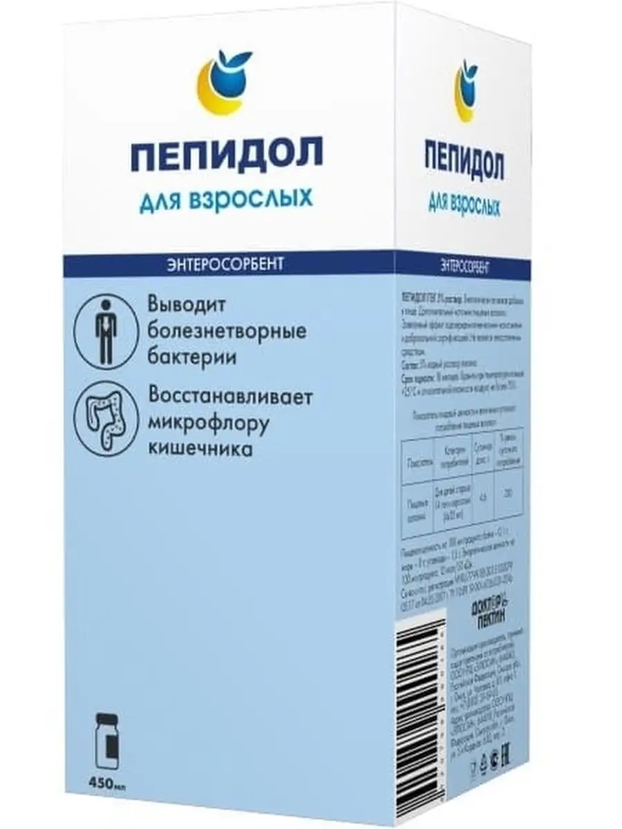 Пепидол взрослый 5% 450 мл - жидкий натуральный сорбент (стабилизированный раствор пектина). ПЕПИДОЛ - антибактериальный энтеросорбент. Его основа - пектин. Это универсальный препарат растительного происхождения. Обладает способностью избирательно уничтожать всю патогенную и условно-патогенную кишечную флору, не повреждая нормальную флору кишечника. Многолетние исследования раскрыли многоплановость воздействия ПЕПИДОЛА на организм человека. В результате было установлено: (1) ПЕПИДОЛ оказывает бактерицидное действие на болезнетворные бактерии, при этом нормальная микрофлора к нему не чувствительна. Это способствует развитию и колонизации в кишечнике собственных полезных микроорганизмов; (2) попадая в желудочно-кишечный тракт ПЕПИДОЛ образует гели, которые, продвигаясь по кишечнику, захватывают токсичные вещества и защищают слизистые от раздражения; (3) в процессе усвоения пищи ПЕПИДОЛ соединяется с токсинами, солями тяжелых металлов и радионуклидами, в результате образуются нерастворимые комплексы, которые, не всасываясь в слизистую оболочку желудочно-кишечного тракта, выводятся из организма. Т.е. в отличие от других сорбентов, ПЕПИДОЛ необратимо связывает токсины и т.п., полностью исключая их всасывание через слизистую оболочку кишечника; (4) защитное действие ПЕПИДОЛА объясняется также его способностью восстанавливать работу (перистальтику) кишечника, устраняя запоры, и способствуя, тем самым, быстрому выведению токсинов и шлаков. В то же время, при поносах ПЕПИДОЛ замедляет перистальтику, и способствует полноценному усвоению всех необходимых организму веществ; (5) ПЕПИДОЛ, связывая желчные кислоты, обеспечивает гипохолестеринемический эффект. Связывает аллергены и токсины в просвете кишечника, уменьшает проницаемость стенки кишечника, повышает защитные свойства слизистой оболочки кишечника, укрепляет общий иммунный статус организма. Применяется при кишечных инфекциях, интоксикациях, отравлениях, запорах, дисбактериозе, токсикозе, при пищевой аллергии, после приема антибиотиков для восстановления микрофлоры, энтериты при онкологии, для очищения организма, во время диеты, от похмелья. Не имеет побочных действий, аллергические реакции отсутствуют. Способ применения: Для взрослых и детей старше 14 лет - каждые 3 часа (4-5 раз в день), за 1 час до еды, по 25 мл (2 ст. ложки). Условия хранения: хранить в сухом месте при температуре не выше +25 °C. Не боится замораживания. После вскрытия флакон хранить в холодильнике не более 10 дней. Срок годности: 18 месяцев. Производитель: ООО НПЦ "ЭЛЮСАН".