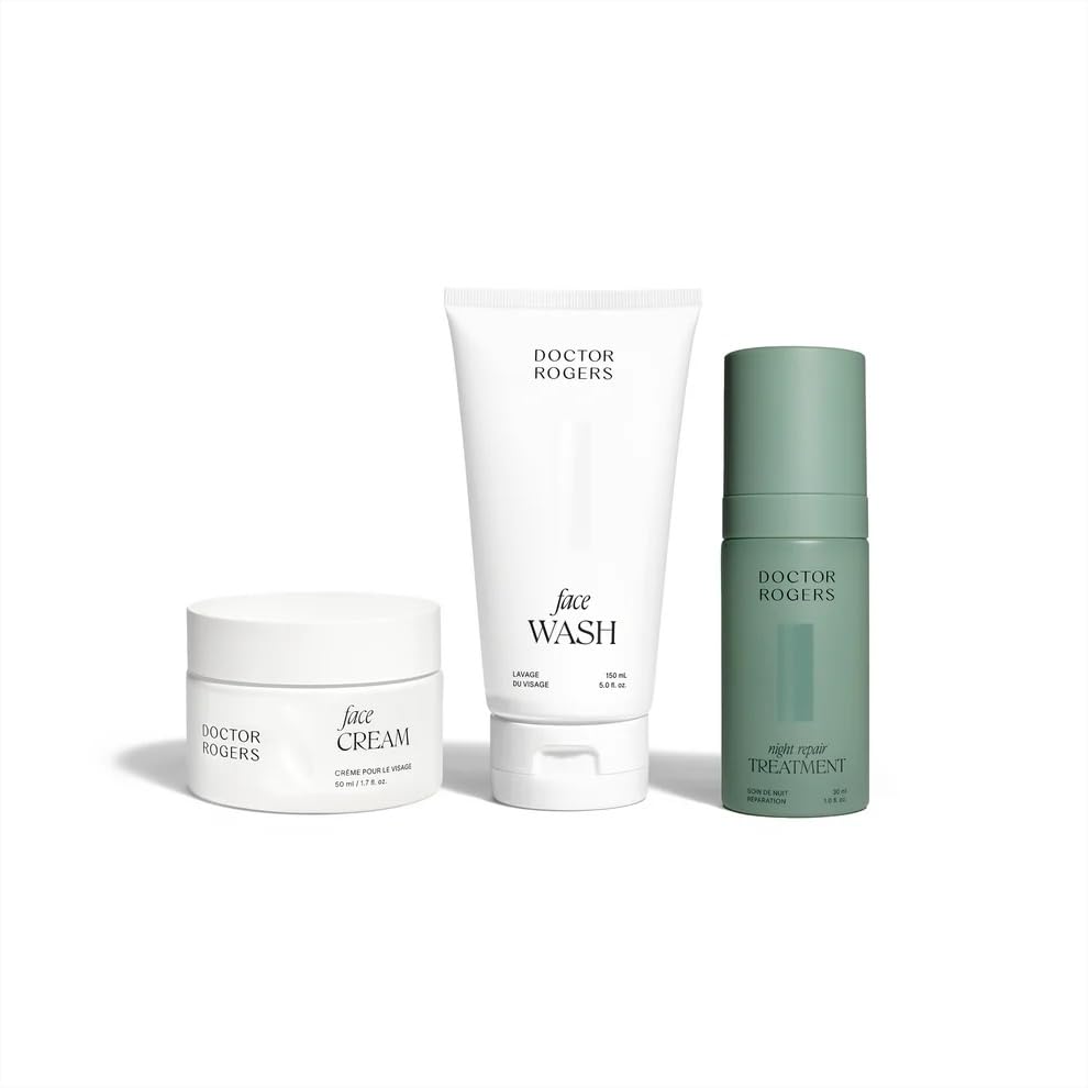 Elevate your night routine with this curated set. Cleanse, repair and hydrate in just three steps. Face Wash (5oz), Face Cream (1.7oz), Night Repair Treatment (1oz) Overnight Power: Night Repair Treatment is a powerful yet well-tolerated combination of bakuchiol, glycolic acid, and antioxidants. This formula quickly helps to reverse signs of aging, builds collagen, evens skin tone, and improves skin texture. CLEANSER FOR ALL SKIN TYPES: Our face wash can be used on all skin types, sensitive, dry, normal, combination, and oily skin It's safe for healing, fragile skin. Dermatologist created. Hydratomg Anti-Aging Face Cream Improves skin health calms swelling. Barrier-strengthening, all-day deep hydration. Fades the signs of aging for a radiant toned appearanceSKINCARE ESSENTIALS: Doctor Rogers understands healthy radiant skin instills confidence. Our products are formulated to support skin using only effective plant-derived hypoallergenic, cruelty-free, vegan biodegradeable ingredients to achieve outstanding results. Night Repair Treatment: Powerful well-tolerated combination of bakuchiol, glycolic acid, and antioxidants. This formula quickly helps to reverse signs of aging, builds collagen, evens skin tone, and improves skin texture. Face Wash: Gentle Effective. Easily remove makeup, sunscreen grime without stripping skin of its natural protection. A gentle, effective face wash designed to deeply cleanse your skin while maintaining its natural balance. Face Cream: Powerful ingredients to visibly reduce pores, wrinkles, fine lines, redness. Leaves skin feeling soft, smooth, calm with a rich, silky texture that never feels oily or heavy. Elevate your night routine with this curated set. Cleanse, repair hydrate in just three steps. Face Wash (5oz), Face Cream (1.7oz), Night Repair Treatment (1oz).