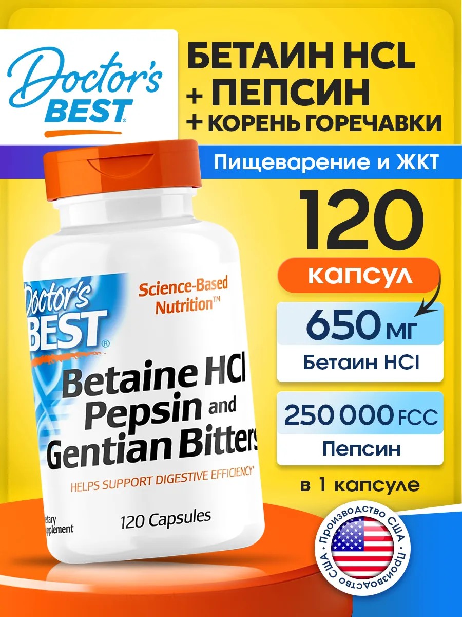 Doctor's BEST Бетаин Пепсин и горечавка для пищеварения 120 кaпсул