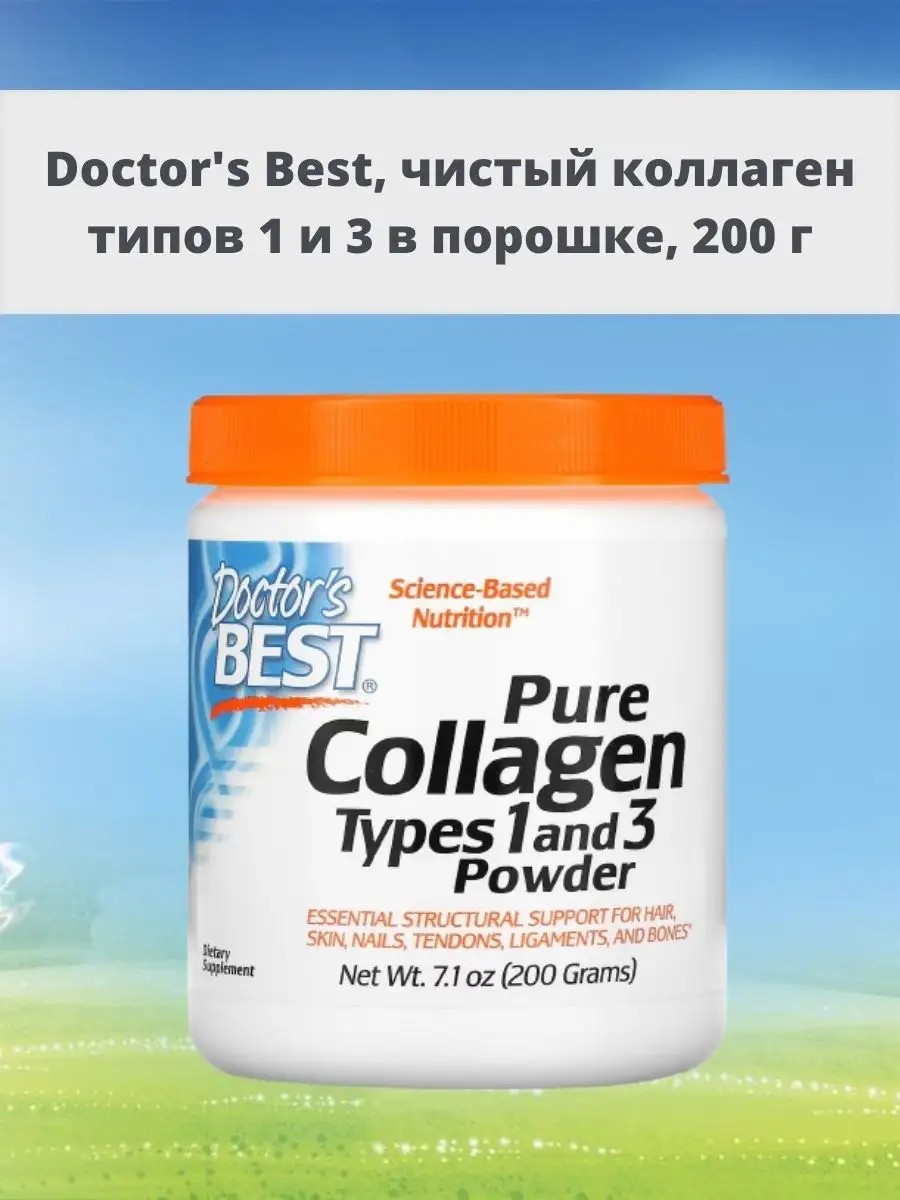 Коллаген типов 1 и 3 в порошке от Doctor's Best содержит чистый белок коллаген, который способствует росту и здоровью тканей. Коллаген — это структурный белок, необходимый для прочности костей и гибкости суставов сухожилий связок волос кожи ногтей и других тканей организма. Рекомендации по применению: Взрослым: Растворите 1 мерную ложку порошка в небольшом количестве воды или сока. Предупреждения