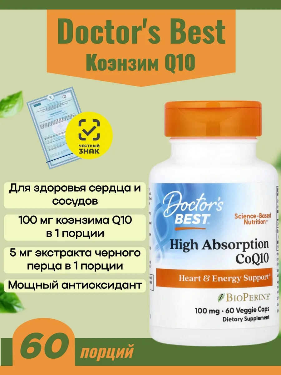Коэнзим Q10 с высокой степенью всасывания от Doctor's Best содержит экстракт черного перца BioPerine, который улучшает усвояемость и биодоступность.