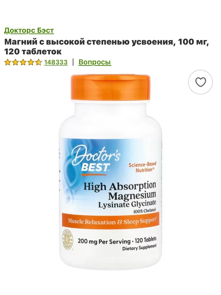 | Комплектация | Магний Doctor's Best High Absorption Magnesium |