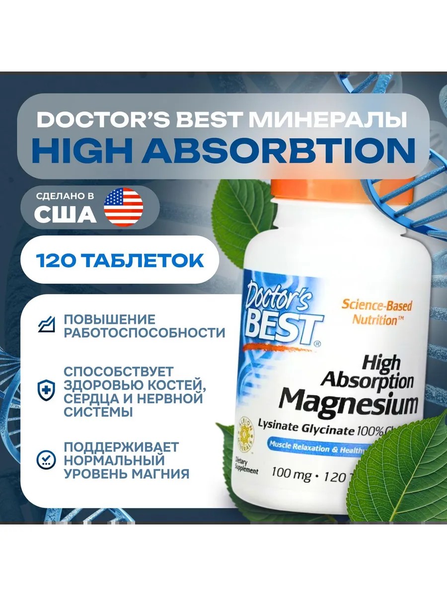 Doctor's BEST Магний 100мг 120 таблеток с высокой степенью усвоения