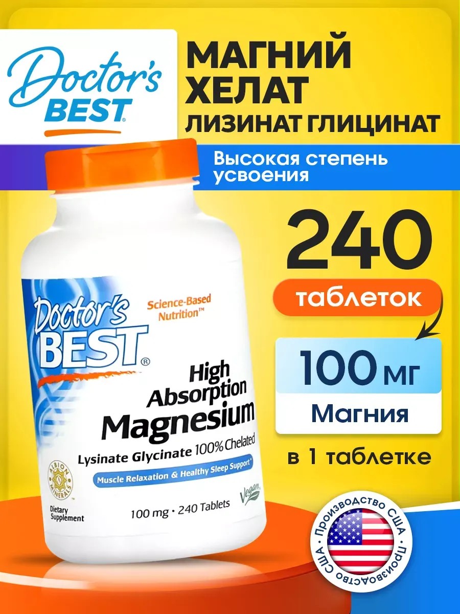 Doctor's BEST Магний хелат 100 мг Magnesium Lysinate Glycinate 240 Tablets