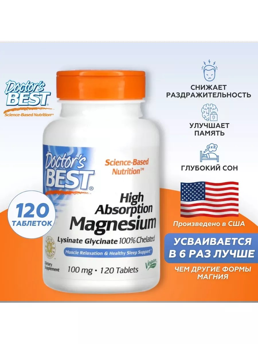 В легкоусвояемом продукте от Доктора Беста используется запатентованная органическая хелатная форма магния для повышения биодоступности и желудочно-кишечной переносимости. Он не содержит буферных веществ и усваивается легче, чем оксид магния. Магний представляет собой важный для организма микроэлемент, который, в частности, помогает клеткам вырабатывать метаболическую энергию, способствует оптимальному функционированию нервной системы, помогает мышцам правильно расслабляться и обеспечивает нормальное сердцебиение. Доказано, что лизин и глицин эффективно переносят микроэлементы, которые облегчают всасывание веществ в ЖКТ.Способ применения. Принимать по 2 таблетки 2 раза в день.