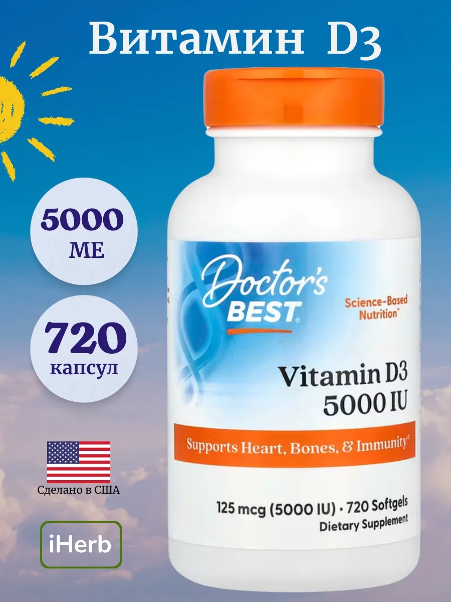 Doctor's Best Vitamin D3 — это витаминный комплекс, обеспечивающий высококачественный источник витамина D3 для поддержки иммунной системы, здоровья костей и сердца.