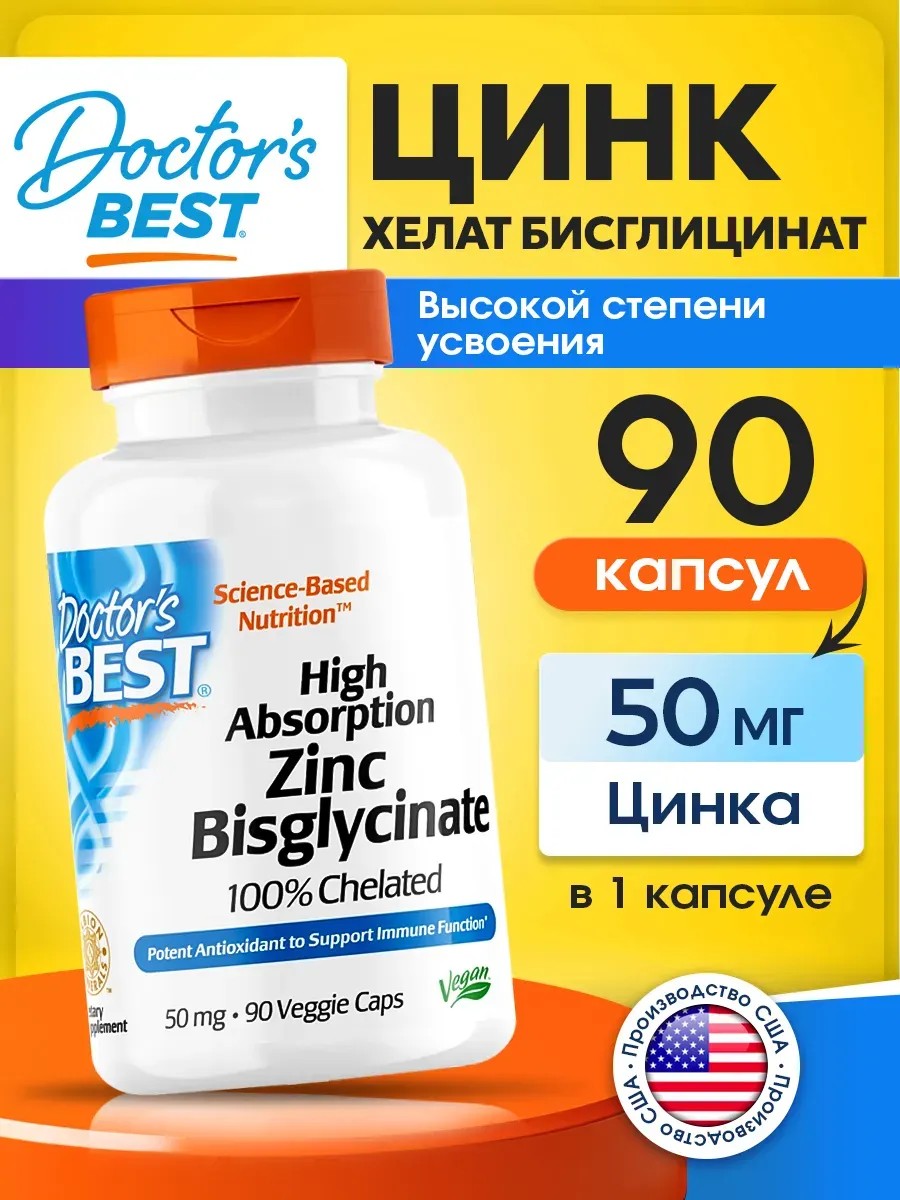 Doctor's BEST Цинк бисглицинат 50 мг, Zinc Bisglycinate для мышц и кожи