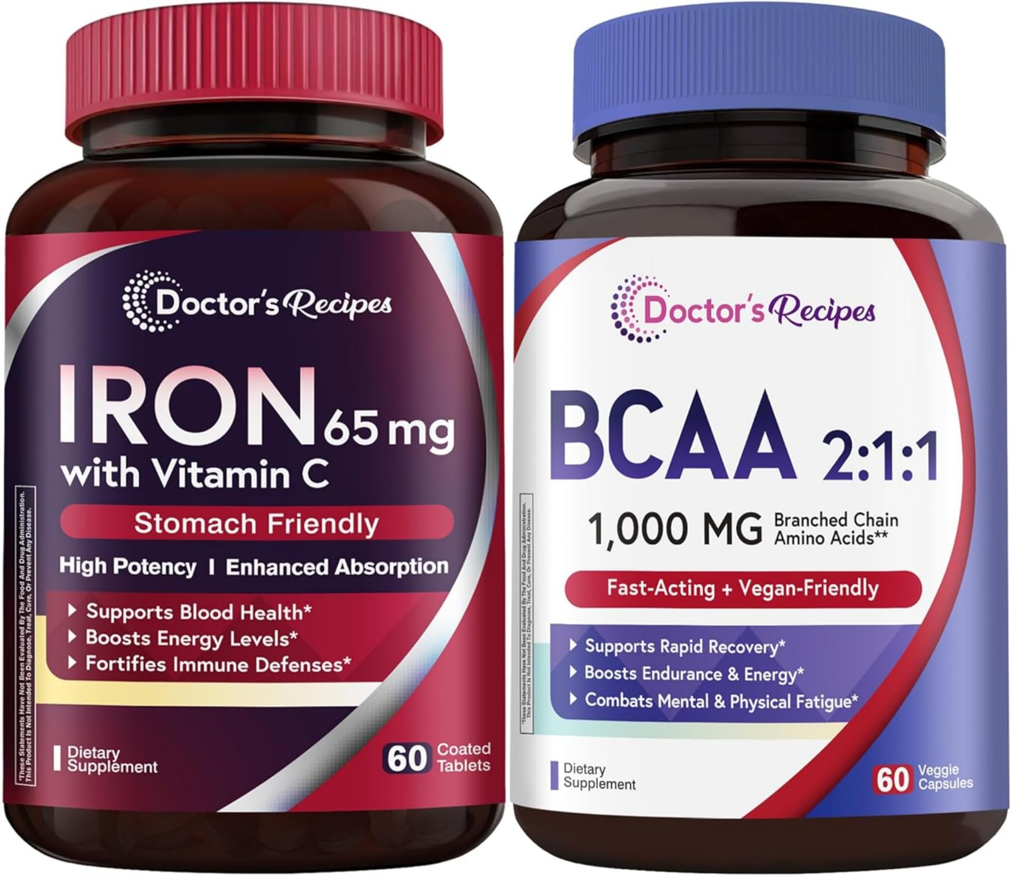 Doctor's Recipes Iron + BCAA Bundle Iron 65 mg with Vitamin C for Absorption & Red Blood Cell Support + 2:1:1 BCAA for Energy Endurance & Faster Recovery Vegan Non-GMO Daily Wellness Pack