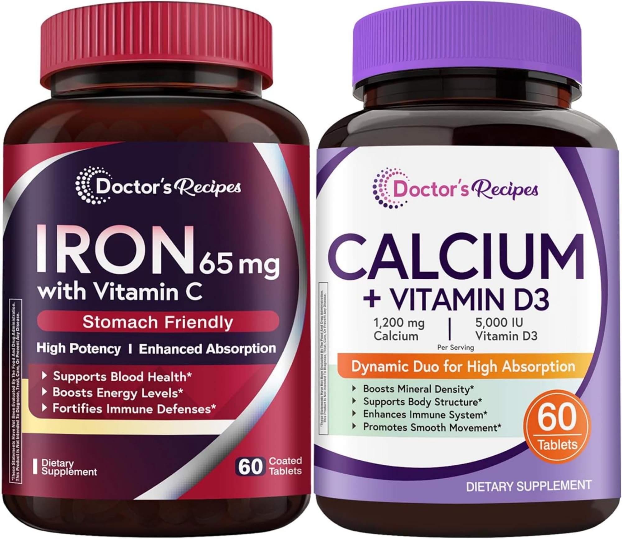 Doctor's Recipes Iron Calcium with D3 Bundle: High Absorption Iron with Vitamin C Bone Support Calcium, Complete Mineral Supplement for Immune, Blood Bone Health