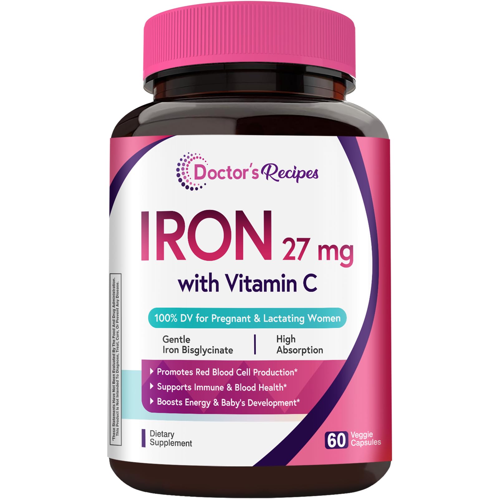Personal Choices, Professional Solutions: At Doctor's Recipes, we believe the products and services should be done professionally and with enthusiasm. Doctor's Recipes nourishes the goodness inside your body to help you maintain a healthy lifestyle. We have everything you need and nothing you don't, and you will always know what you're putting in your body. The name of this exceptional brand leaves little to imagination, and it's a title well-deserved. Proudly Made in the USA: Our advanced strength formula is loaded with the highest grade naturally sourced ingredients in a GMP certified facility in the USA. Doctor's Recipes Iron supplement is 100 pure, natural, vegan friendly NON-GMO with no soy, gluten and dairy. Pregnancy Must-Have: Our iron supplement helps nourish both you and your little one. For moms and moms-to-be, iron helps maintain healthy red blood cell production, boost energy levels, and support overall vitality during this demanding time. For your baby, adequate iron intake is crucial for healthy growth, brain development, and strong immune function. . Gentle on the Stomach Enhanced Absorption: Crafted with iron bisglycinate, a bioavailable, gentle, chelated form of iron, our iron supplement is easy on the stomach. No common side effects like nausea or constipation. Plus, we've added 120 mg of vitamin C (also 100 Daily Value) to enhance iron absorption, so your body reaps the maximum benefit from every vegan capsule. . 27 mg of Elemental Iron: During pregnancy and lactation, your body's iron needs increase significantly to support the production of extra blood, ensuring oxygen and essential nutrients are delivered to you and your growing baby. Our Iron supplement is specially formulated with 27 mg of elemental iron (100 of the Daily Value for pregnant and lactating women), ensuring optimal iron levels and healthy blood volume expansion. .