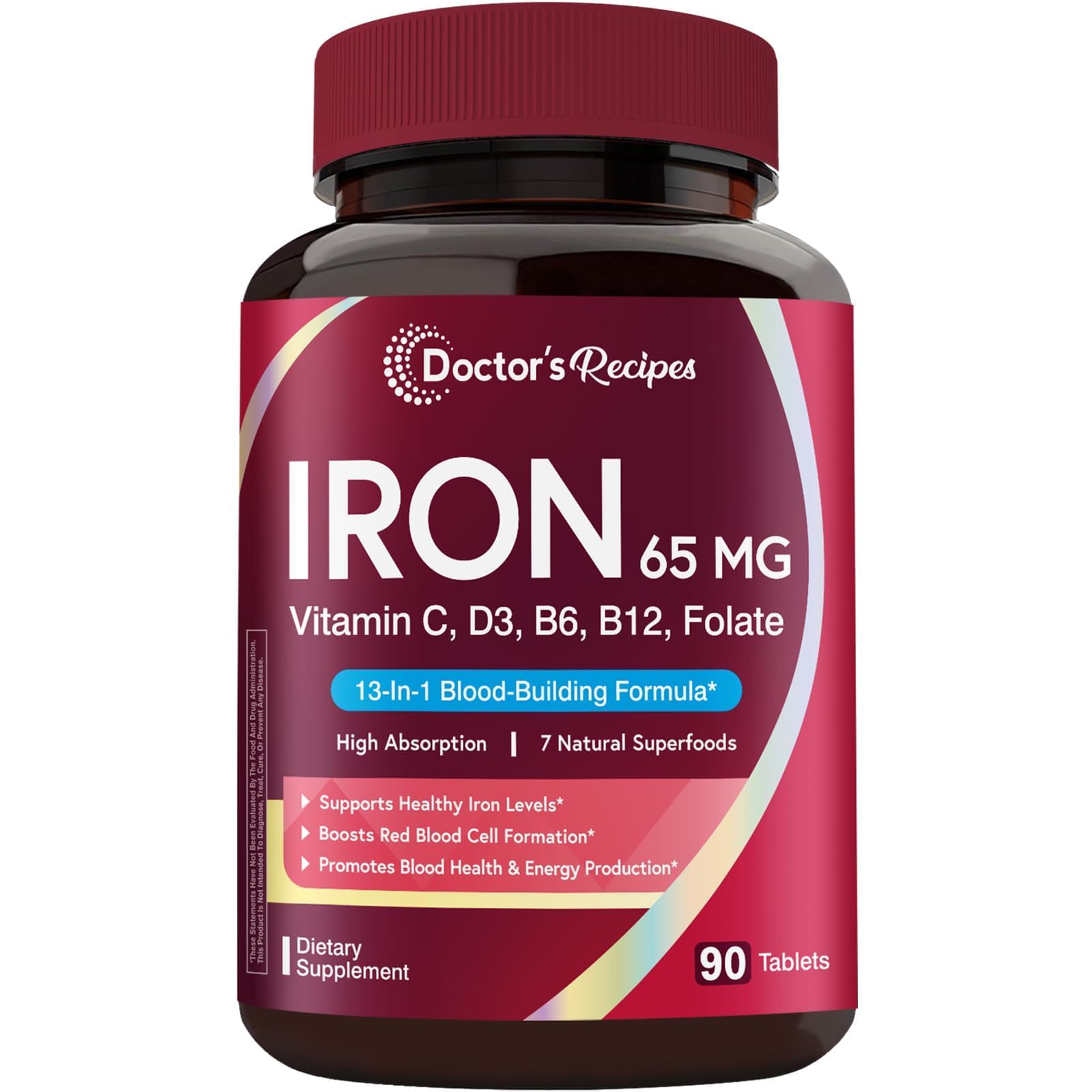 Personal Choices, Professional Solutions: At Doctor's Recipes, we believe the products and services should be done professionally and with enthusiasm. Doctor's Recipes nourishes the goodness inside your body to help you maintain a healthy lifestyle. Non-GMO: Our advanced strength formula is loaded with the highest grade naturally sourced ingredients. Doctor's Recipes iron supplement is 100 pure and NON-GMO with no soy, gluten and dairy. Boost Energy, Immune Blood Health : Feeling tired or sluggish? This high-potency iron supplement for women and men supports healthy red blood cells and promotes hemoglobin formation for optimal oxygen flow throughout your body, so you can face each day with renewed energy. It also helps boost strong immune defenses with vitamin D3. . With B Vitamins Iron-Boosting Superfoods : Beyond iron, this formula is enhanced with bioavailable vitamin B6 (P-5-P), methyl B12 and folate to support red blood cell production and overall blood health. Plus, our exclusive iron-boosting superfood blend features 7 natural ingredients like beet root, spinach, and pumpkin seeds, offering plant-based iron and antioxidant support for all-around vitality. . High Potency 65 mg of Elemental Iron: Your body requires iron to make hemoglobin and transport oxygen. That's where our iron supplement steps in. Each tablet is packed with 65 mg of elemental iron, a powerful dose to efficiently increase iron levels, especially beneficial for menstruating girls, pregnant lactating women and athletes. 30 mg of vitamin C is added to maximize iron absorption. .