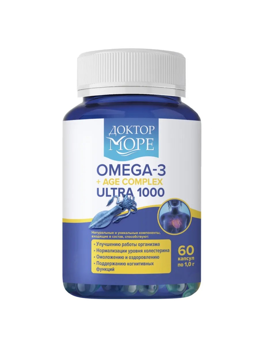 Доктор море omega-3+age tra 1000 60 шт. капсулы массой 1000 мг - представляющая собой Омега-3 с АГЭ-комплексом из печени кальмара в фосфолипидной форме, практически полностью усваивается организмом, обеспечивая максимальную эффективность. Формула Омега-3 от Доктор Море не вызывает побочных эффектов - таких как изжога, вздутие или нагрузка на поджелудочную железу. Главное преимущество - биодоступность. Благодаря фосфолипидной форме, Омега-3 ПНЖК легко растворяются в жидкости и быстро проникают в клетки, обеспечивая мгновенное действие. Основным сырьем является жир печени кальмара - более чистый и безопасный источник. Сочетание АГЭ-комплекса с Омега-3 усиливает всасывание и транспортировку этих ценных кислот, обеспечивая их максимальную эффективность.