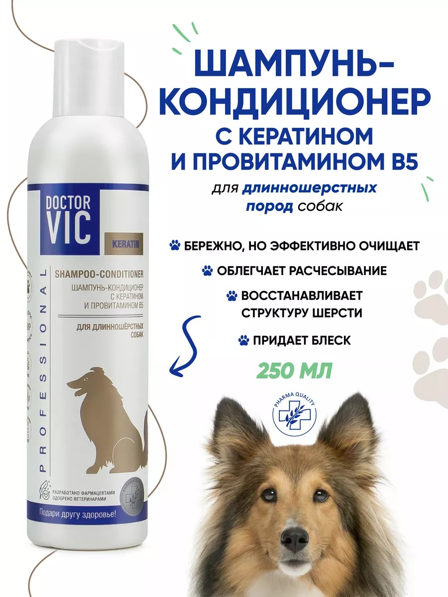 Шампунь для длинношерстных собак гладкая шерсть 250 мл Doctor VIC — профессиональное средство 2-в-1 для ухода за шерстью. Подходит для ежедневного применения и рекомендован для пород с длинной шерстью: йорков, ши-тцу, колли, кокер-спаниелей.