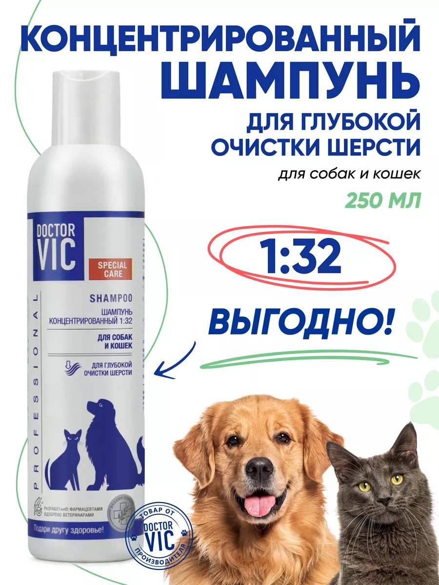 Шампунь для собаки и кошки концентрированный 250 мл Doctor VIC обеспечивает глубокое очищение шерсти, удаляет стойкие загрязнения и придает мягкость, шелковистость и сияние. Подходит для всех типов шерсти: длинной, короткой, густой, облегчает расчесывание и предотвращает образование колтунов. Экстракты персика, груши, маракуйи и киви ухаживают за кожей питомца, увлажняют и питают её. Концентрированная формула экономична в использовании: 1 часть шампуня на 32 части теплой воды. Для применения обильно смочите шерсть теплой водой, распределите раствор по телу животного, массируя до появления пены, через 5 минут смойте теплой водой и просушите полотенцем или феном. При попадании в глаза промыть водой. Гарантированный профессиональный уход в домашних условиях, безопасен при соблюдении инструкции. Ключевые слова: концентрированный шампунь для собак и кошек, шампунь для собак и кошек, уход за шерстью собак и кошек, глубокое очищение шерсти, мягкая и шелковистая шерсть, Doctor VIC, экономичный шампунь для животных.