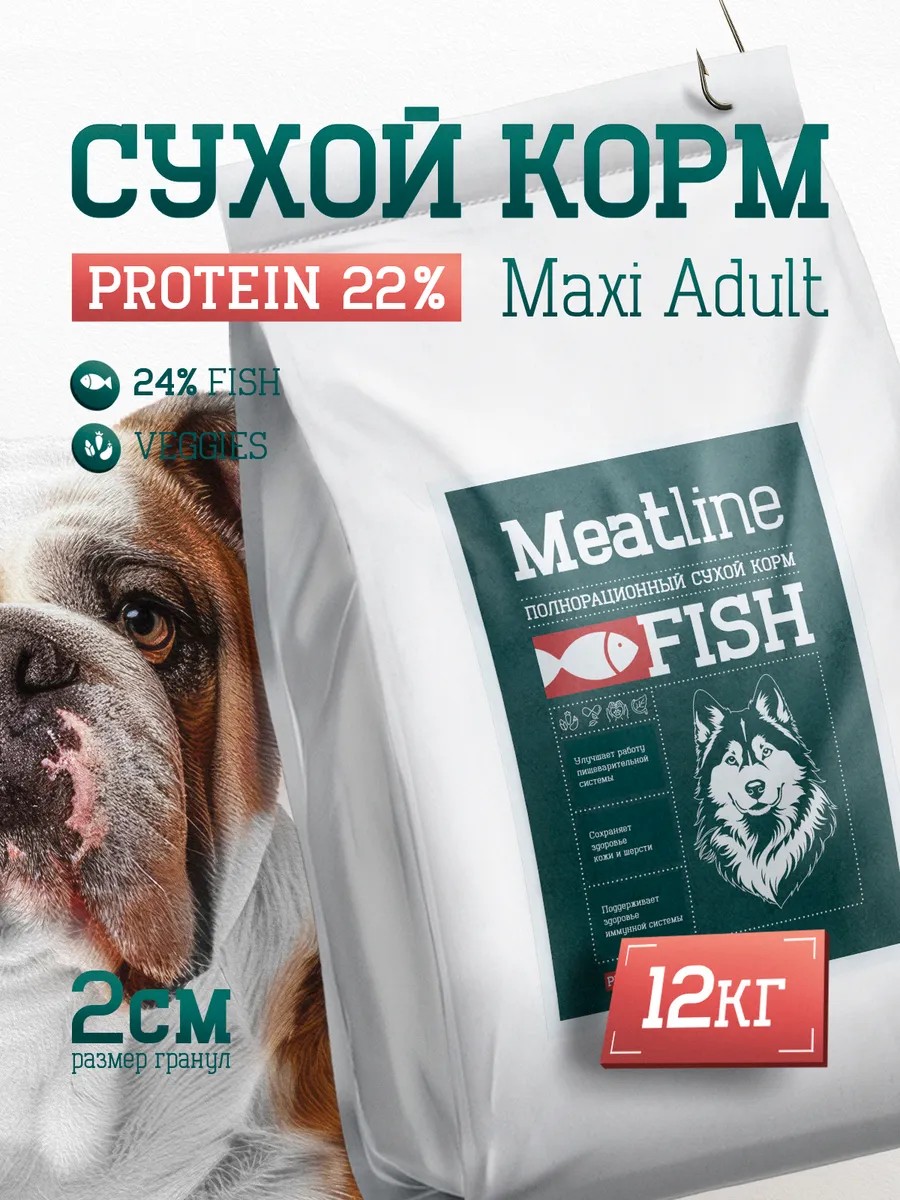 | Полное наименование товара | Сухой корм для собак 2.0 Meatline mono standart Maxi Adult(рыба 24%) протеин 22%, 12 кг |