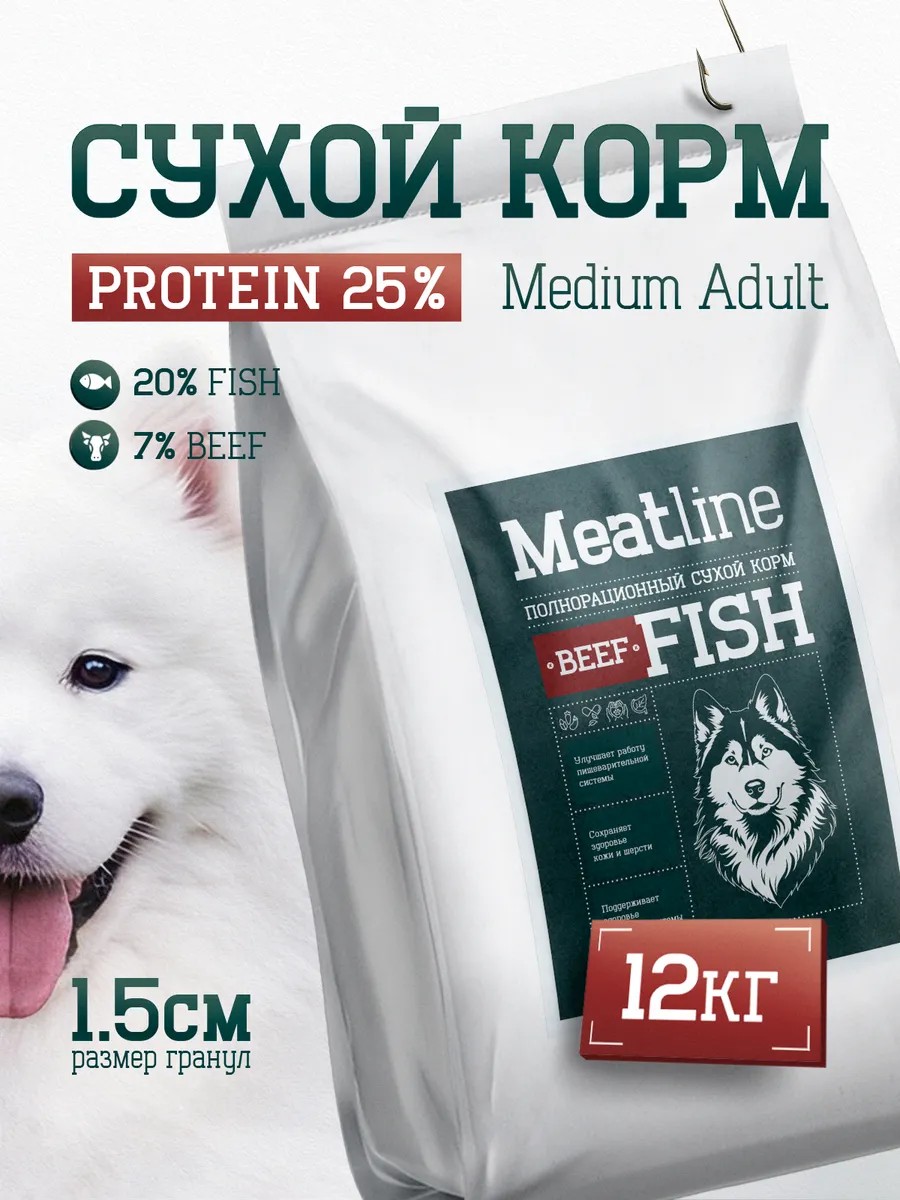 | Full product name | Dry dog food 1.5 Meatline Medium Adult (fish 20%, beef 7%) protein 25.5%, 12 kg |