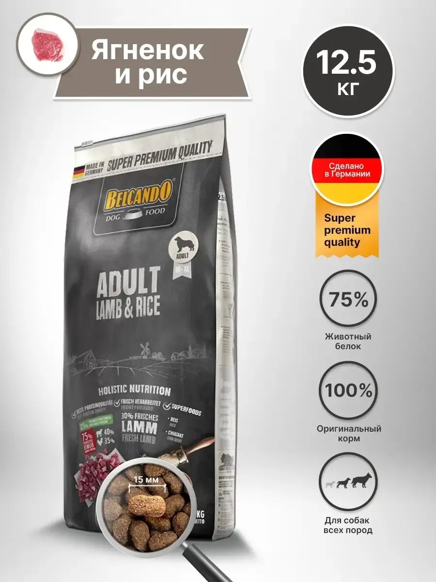 Сухой корм BELCANDO Adult Lamb & Rice Белькандо (ягненок и рис) для взрослых собак с 1 года жизни средних и крупных пород с нормальным уровнем активности, гипоаллергенный. Легко переваривается благодаря подобранным комбинациям компонентов: легко усваиваемый рис, ценные семена чиа для поддержки пищеварения, которые являются незаменимым источником жирных кислот и большое количество филе ягнёнка (30%), которое обеспечивает хорошую переносимость для чувствительных и склонных к аллергиям собак. Упаковка 12,5 кг. Состав белков и жиров адаптирован к потребности в энергии у собак с нормальным уровнем активности. Изготовлено без применения пшеницы, кукурузы, сои, молочных продуктов. Источники белка: животный белок - 75% (мясо птицы - 35%, ягнятина - 40%), растительный белок - 25%. Размер гранул - 15 мм. Попробуйте этот собачий корм уже сегодня и обеспечьте своему питомцу полноценное питание и здоровую жизнь!