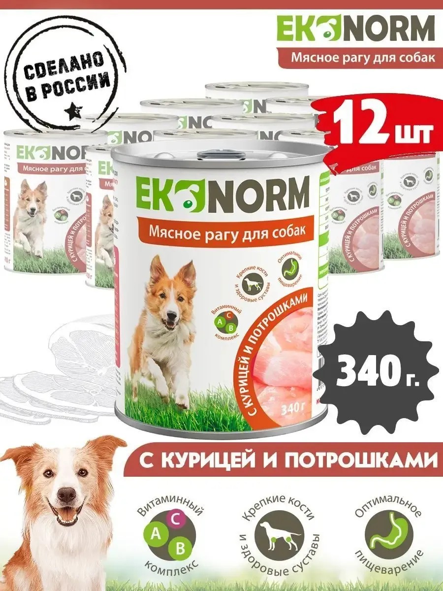 Ekonorm wet dog food is 100% animal protein. This canned dog food with a complex of vitamins and minerals is suitable for daily use and is available in 100g, 340g, and 410g sizes for convenience. Ekonorm canned dog food is made from two types of fresh meat. 100% natural! No added soy, plant components, or artificial flavors. Highly nutritious and digestible, with a rich taste. Ekonorm is the key to your pet's good health and excellent mood! Ingredients: meat, by-products, tripe, blood plasma, gelling agent, fiber, salt. Feeding rate: 70-90g per 1kg of animal weight. Serve at room temperature. To diversify the diet with an additional source of energy and carbohydrates, mix the canned food with the Four-legged Gourmet "Golden Recipes" cereal: article 17191088 or 17191089. Wet food treats for dogs of large, medium, and small breeds. Suitable for all breeds: German Spitz, French Bulldog, Chihuahua, Yorkshire Terrier, King Charles Spaniel, Akita, Shiba Inu, Beagle, Pit Bull, Doberman, Corgi, Rottweiler, Labrador, Pug, German Shepherd, Dachshund, Husky, Jack Russell, etc.