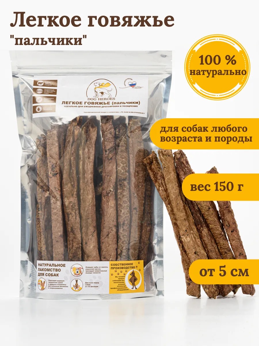 Говяжье легкое (пальчики) нарезанное легкое палочками длиной от 5 и более сантиметров. Данная форма нарезки часто используется на тренировках собак хендлером при подготовке к выставке. Палочка легко ломается на нужные кусочки, поэтому продукт очень удобно использовать в качестве поощрения при тренировках, так и просто на прогулках. Также, часто используется для малых пород собак в качестве лакомства для погрызушек. Герметичную упаковку 150 грамм удобно брать с собой на занятия.