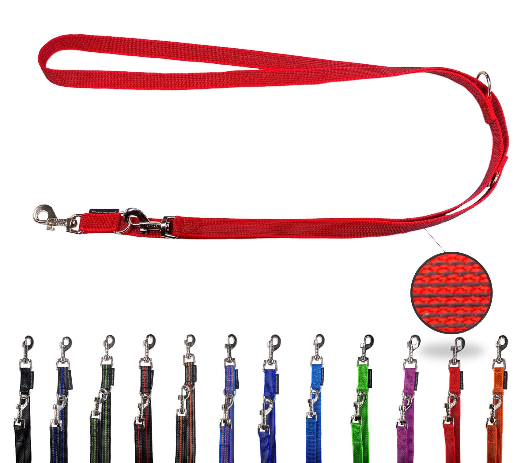 Made in Germany!Own production.The leash is machine washable at 30 C and is 20mm wide.We only use the highest quality, stable hooks, because it should not be saved at this point.1. Hook approx. 70mm long, 2nd hook approx. 70mm long, the rings have a duch knife of 30mm and 25mm.Both carabiners with a turning vertebrae.Adjustable lengths: 2m 3 compartment adjustable, at 2.40m 3 -fold adjustable - 2.20m m. Hand loop, 1.50m, 1.20m at 2.80m 4 times adjustable - 2.60m m hand loop, 2.10m, 1.80m, 1.40m at 3.50m 4 times adjustable - 3.30m m m. Hand loop, 2.80m, 2.20m, 1.70m at 5.00m 5 times adjustable - 4.80m m hand loop, 4.20m, 3.60m, 3.00m, 2.50m.The leash is made of UV-stabilized polypropylene belt strap, 7 stable rubber threads are woven through, the leash is well in the hand, is very stable and has a good grip.The leash is equipped with two very stable carabin hooks.MADE IN GERMANY! Eigene Herstellung. Die Leine ist maschinenwaschbar bei 30 C und ist 20mm breit. Wir verwenden nur die hochwertigsten, stabilsten Haken, denn an diesem Punkt sollte nicht gespart werden. 1. Haken ca. 70mm lang, 2. Haken ca. 70mm lang, die Ringe haben einen Duchmesser vom 30mm und 25mm. Beide Karabiner mit Drehwirbel. Einstellbare Längen: 2m 3 fach verstellbar, Bei 2,40m 3fach verstellbar - 2,20m m. Handschlaufe, 1,50m, 1,20m Bei 2,80m 4fach verstellbar - 2,60m m. Handschlaufe, 2,10m, 1,80m, 1,40m Bei 3,50m 4fach verstellbar - 3,30m m. Handschlaufe, 2,80m, 2,20m, 1,70m Bei 5,00m 5fach verstellbar - 4,80m m. Handschlaufe, 4,20m, 3,60m, 3,00m, 2,50m. Die Leine ist aus UV-stabilisertem Polypropylen-Gurtband, es sind 7 stabile Gummifäden durchgewebt, die Leine liegt gut in der Hand, ist sehr stabil und hat einen guten Griff. Die Leine ist mit zwei sehr stabilen Karabinerhaken ausgestattet.Hundeleine gummiert verstellbar Doppelleine gummiert für mittlere und große Hunde 2m 2,40m 2,80m 3,50m 5m (Rot, 2,80m) 2,80m Rot