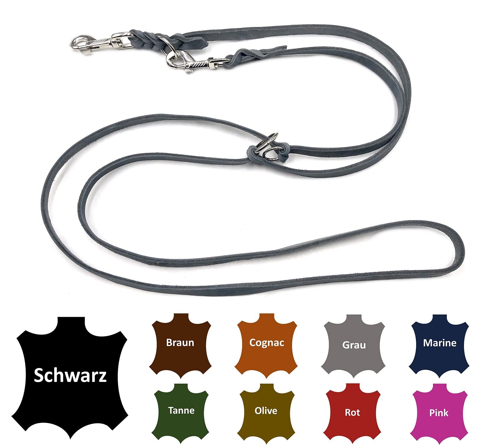 Verstellbare Doppelleine ist in den Längen 2,00m / 2,40m / 2,80m / 3,50m / 5,00m. Diese Hundeleine wird mit einem sehr hochwertigen Rindleder verarbeitet und liegt somit sehr gut in der Hand. Der Karabinerhaken an dieser Doppelleine ist 360° drehbar, somit kann der Hund in jegliche Richtungen laufen und die Leine passt sich der Bewegung an. Des Weiteren ist diese Doppelleine in 9 verschiedenen Farben wählbar. Somit ist wirklich für jeden etwas dabei.