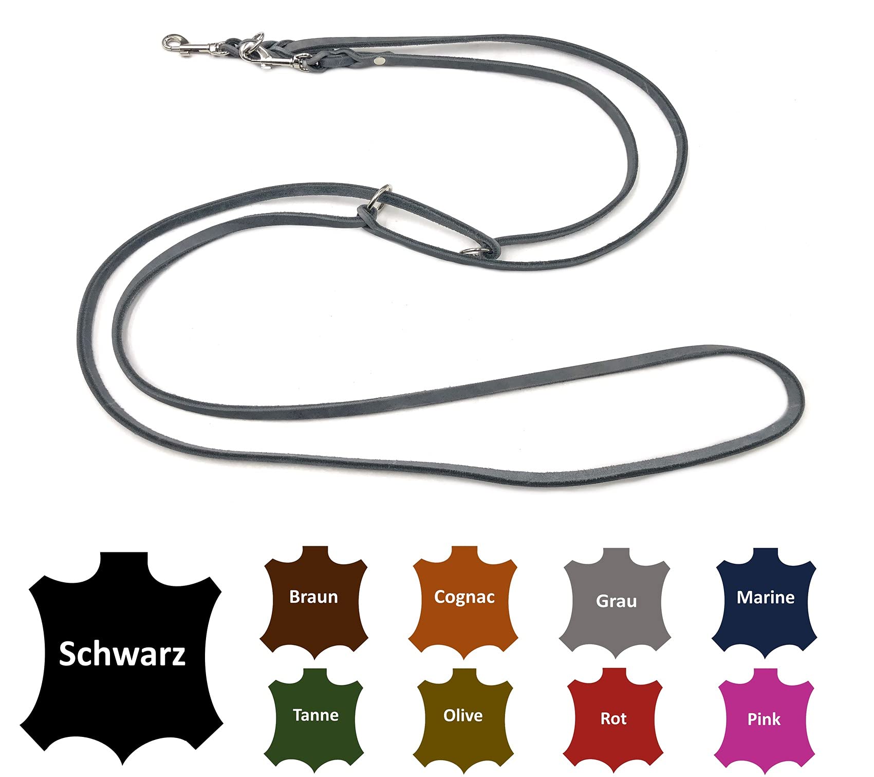 Verstellbare Doppelleine ist in den Längen 2,00m / 2,40m / 2,80m / 3,50m / 5,00m. Diese Hundeleine wird mit einem sehr hochwertigen Rindleder verarbeitet und liegt somit sehr gut in der Hand. Der Karabinerhaken an dieser Doppelleine ist 360° drehbar, somit kann der Hund in jegliche Richtungen laufen und die Leine passt sich der Bewegung an. Des Weiteren ist diese Doppelleine in 9 verschiedenen Farben wählbar. Somit ist wirklich für jeden etwas dabei.