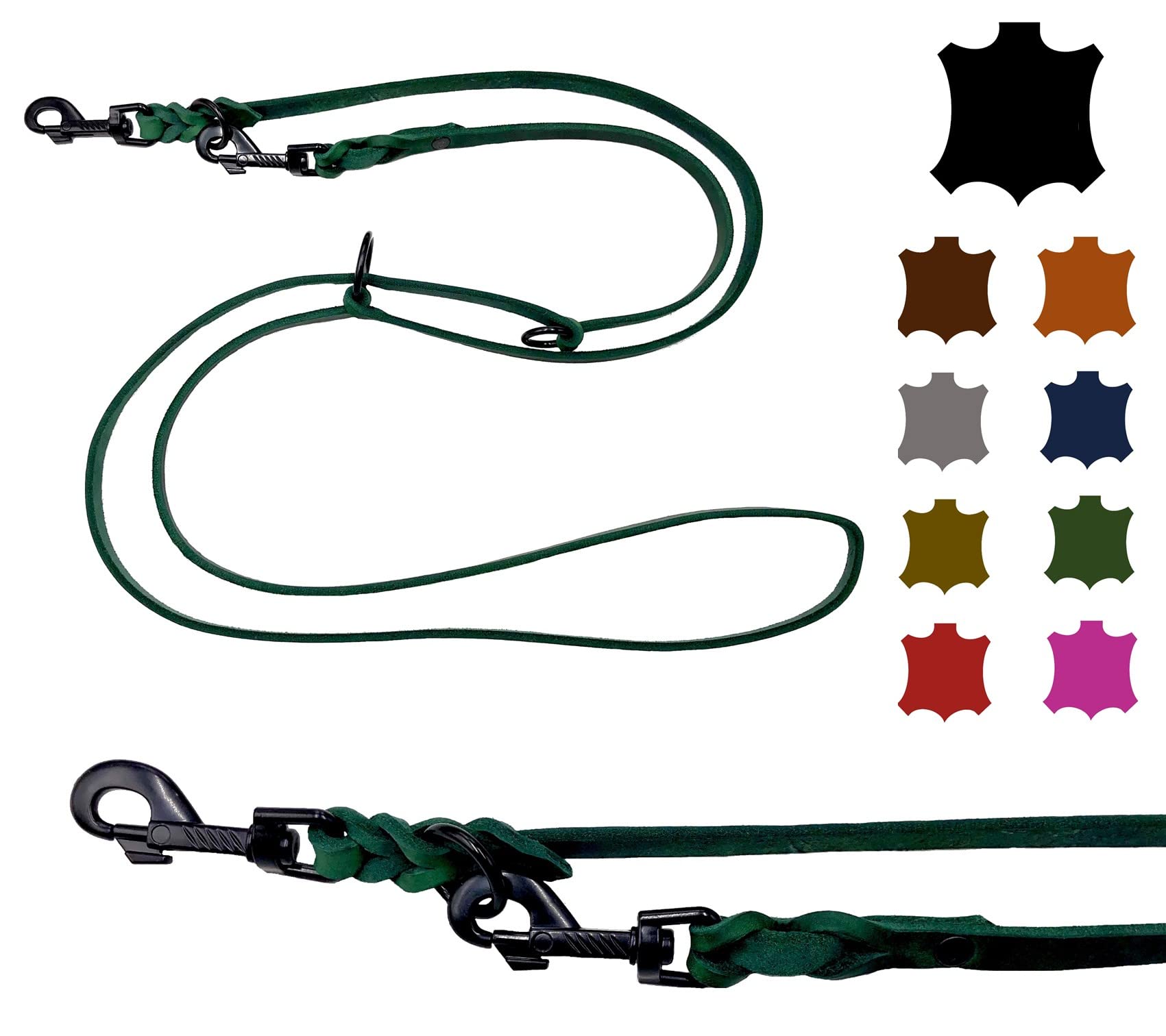 Verstellbare Doppelleine ist in den Längen 2,00m / 2,40m / 2,80m / 3,50m / 5,00m. Diese Hundeleine wird mit einem sehr hochwertigen Rindleder verarbeitet und liegt somit sehr gut in der Hand. Der Karabinerhaken an dieser Doppelleine ist 360° drehbar, somit kann der Hund in jegliche Richtungen laufen und die Leine passt sich der Bewegung an. Des Weiteren ist diese Doppelleine in 9 verschiedenen Farben wählbar. Somit ist wirklich für jeden etwas dabei.