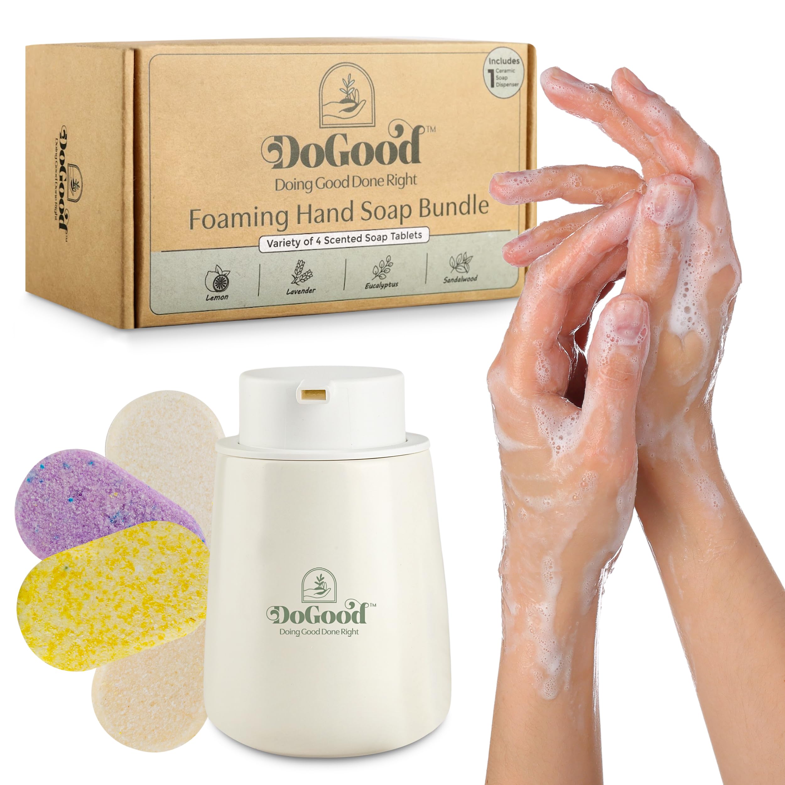 DoGood Foaming Hand Soap Starter Kit Refillable 350 mL Ceramic Dispenser & 4 Scented Tablets Eco-Friendly Zero-Waste Foam Soap (Lavender Lemon Eucalyptus Sandalwood)