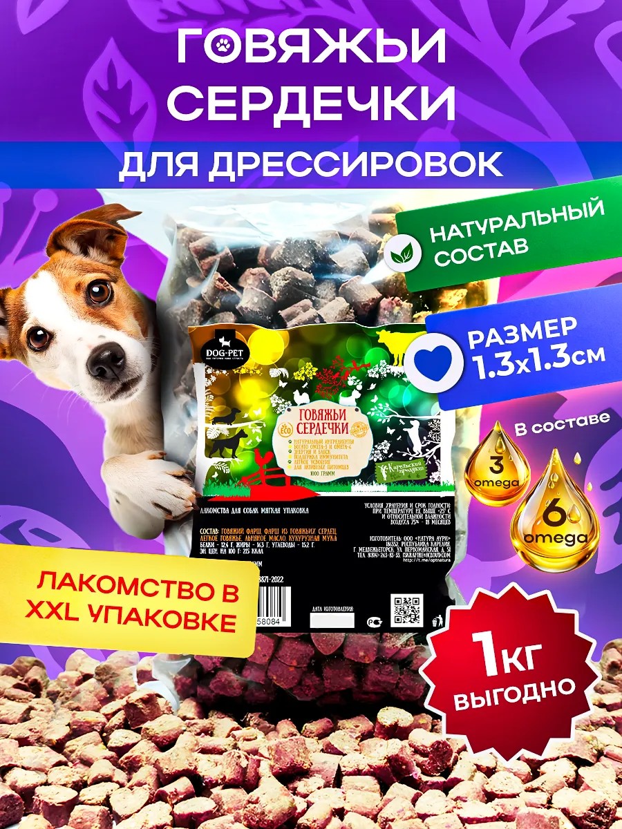 DogPET Говяжьи сердечки , лакомства для собак всех пород - 1000 гр