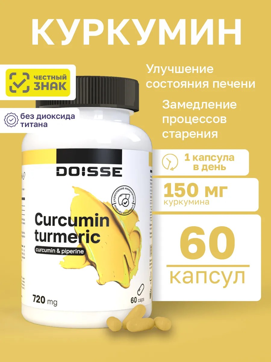 Биологически активная добавка к пище "CURCUMIN TURMERIC" ("КУРКУМИН ТУРМЕРИК") от DOISSE — это эффективный способ поддержать здоровье и благополучие организма. Каждая капсула содержит 156 мг высококачественного экстракта куркумы, богатого куркумином, мощным антиоксидантом с доказанными полезными свойствами. Куркумин в капсулах DOISSE способствует защите клеток печени от повреждений, замедляет процессы старения и нормализует обмен веществ. В состав добавки входит экстракт перца черного, который повышает биодоступность куркумина, делая его усвоение организмом более эффективным. "CURCUMIN TURMERIC" удобен в применении: достаточно принимать по одной капсуле в день. Куркумин в капсулах DOISSE — это натуральный и безопасный способ позаботиться о своем здоровье.