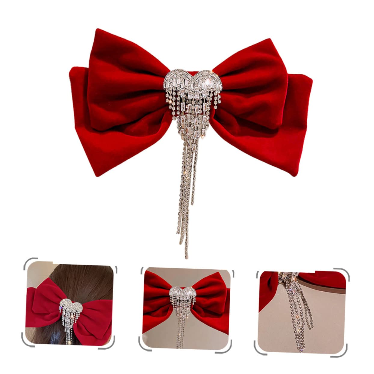 Package List 1 x hairpin Features - Material: Velour, alloy, rhinestone, copper Hair Bowknot Clip - It is easy to put it on and remove it from the hair and will not damage the hair Hair Bow. - Not only embellishes your hair, but also achieves graceful and sweets temperament, make you look more charming and elegant hair clip with tassel design. - Create beautiful hairstyles for daily work office or going out women hair accessories. - Great for women of all ages who want to be in fashion, easily take care of your beautiful hair Bowknot Barrette. - This hair bow clip looks so unique and elegant for party and festival Hair Bow Clip. Goods Information vintage hair accessories Suitable for parties, working and daily using, and easily go well with your different outfit.hair clips for girls This big bow clip is good for a variety of types of hair, especially for securing loose hair or creating a special look.Large Hair Bow Clip Made of good material, safe, strong and durable, and make it much pretty and exquisiteRhinestone hair barrettes: hold your hair in place well and non-slip, not easy to fall off and will not damage your hair. Bow hair barrette: hold your hair in place well and non- slip, not easy to fall off and will not damage your hair. Vintage hair bows: create beautiful hairstyles for daily work office or going out. Red hair accessories for women: not only embellishes your hair, but also achieves graceful and sweets temperament, make you look more charming and elegant. Crystal bow hair clip: you can wear this bow hair clip for any special occasions, like weddings, parties, shopping, traveling, etc.