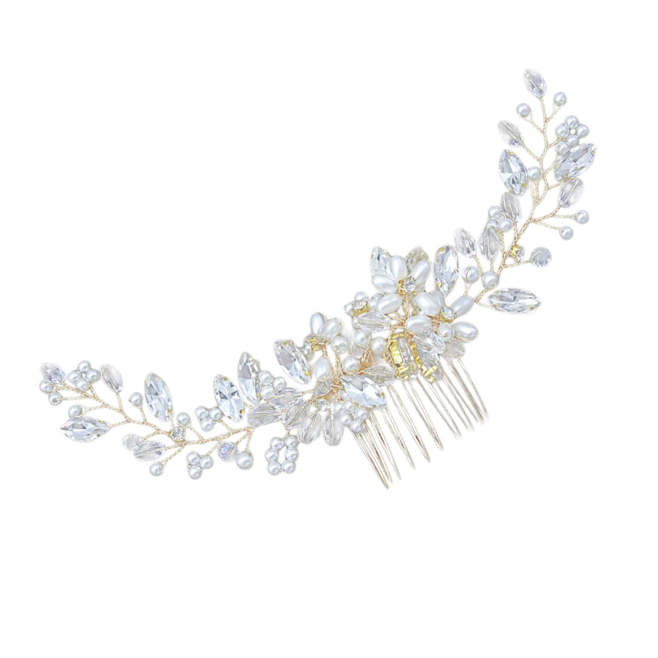 Package Include 1 x hair comb Characteristics - Material: alloy Comb for Bridal. - Size: 20x6x1cm Hair Comb for Bride. - Color: golden Rhinestone Hair Comb. - Delicate hair combs accessories for brides and bridesmaids Wedding Hair Comb. Bride Comb - This wedding hair comb looks gorgeous in almost any wedding day hair style pearl Hair Comb. - This hair comb would be a great choice for a bride or for any special occasion. Best choice for family, friends, and your girlfriend Rhinestone Comb. - It's easy to put into the hair and take out but you may use extra to in case. - Special for wedding, prom, party, engagement, anniversary or other special occasions. Goods Information Comb for Bridal This exquisite designed hair comb is a alternative for headpiece such as crown, tiara or headband.bridal hair comb clip This bridal Rhinestone hair comb is design with artificial flower and pearl, as well as lifelike beautiful crystal leaves.flower girl hair comb Great for bride, bridesmaid, or wear it to a party