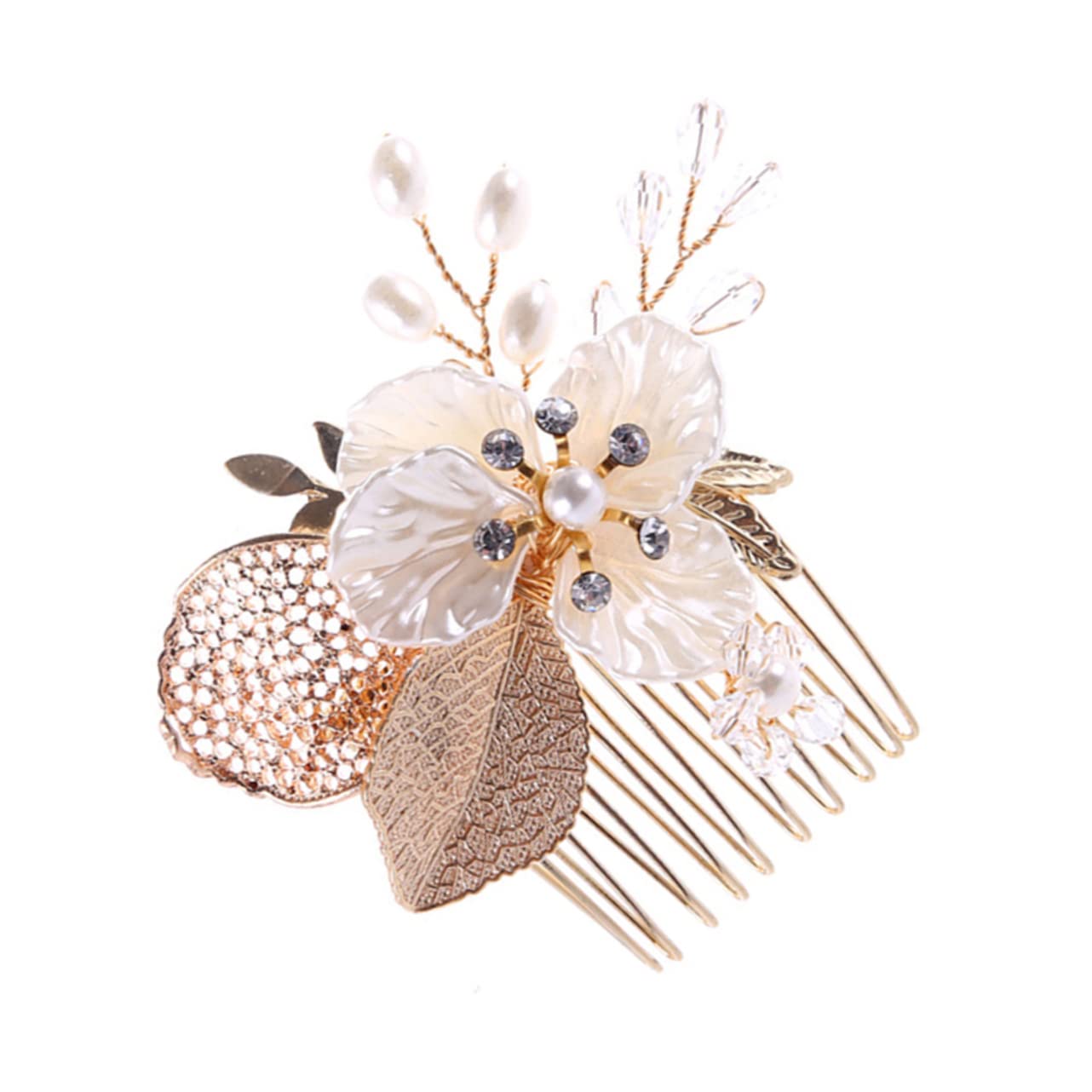 Package Include 1 x hair comb Features - Color: golden Wedding Hair Comb. - Size: 5.5x7x1cm Hair Comb for Bride. - Material: Rhinestone Comb for Bridal. Bride Comb - The wedding hair accessories are suitable for any wedding party theme Rhinestone Comb. - Delicate hair combs accessories for brides and bridesmaids pearl Hair Comb. - It's easy to put into the hair and take out but you may use extra to in case Rhinestone Hair Comb. - Special for wedding, prom, party, engagement, anniversary or other special occasions. - This wedding hairpiece looks gorgeous in almost any wedding day hair style. - This headpiece would be a great choice for a bride or for any special occasion. Best choice for family, friends, and your girlfriend. Goods Description Hair Comb for Bride This exquisite designed hair comb is a alternative for headpiece such as crown, tiara or headband.bride headpieces for wedding Great for bride, bridesmaid, or wear it to a party.wedding This bridal Rhinestone hair comb is design with artificial flower and pearl, as well as lifelike beautiful leaves and crystal