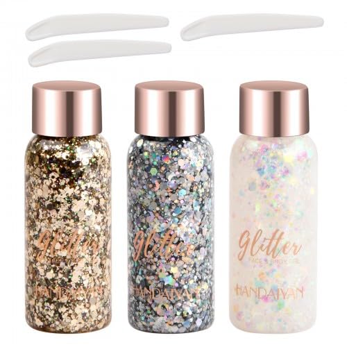 Glitter Body Gel ? Glitter gel in 3 colors for face and body. ? Made with safe, non-toxic materials and a holographic shimmer. ? Always stand out from the crowd with this large glitter gel. ? To use, simply squeeze the product onto your finger or a brush. Apply to the desired area and let it dry. Specifications: Brand: Wisebom Net Contents: 32 ml x 3 pieces Color: 3 colors Weight: 131 g Friendly Tips: Remove thoroughly with makeup remover and soap? Suitable for many occasions: Always stand out from the crowd with this large glitter gel. It's ideal for any event or occasion you attend, especially parties, balls, performances, bars, etc. ? Wide application: Mermaid glitter body gel has a wide range of uses. It can be used for the body, eyeshadow, face, nails, hair, or other creations. It can also be used for some DIY projects. ? Find your color: These body glitter gels are available in white, silver, and gold, including small stars, round, and hexagonal shapes. Choose your favorite color and be the star of every party. ? Premium material: The body glitter is made with high-quality holographic glitter, which is skin-safe, can be used safely on the skin, is very environmentally friendly, harmless, lightweight, and durable. It's easy to apply and remove. ? Package contents: We have three colors in one package: gold, silver, and white, sparkling and beautiful. You can combine different colors to achieve the desired effect.Dokeno Gel Glitter pour le Corps Glitter Body Gel 3 Bouteille Gel pour le Corps avec Paillettes Maquillage Brillant Longue Durée pour Visage Ongles Yeux Lèvres Cheveux Corps (Or Argent et Blanc)DESCRIPTION DU PRODUIT Gel pailleté pour le corps ? Gel pailleté en 3 couleurs pour visage et corps. ? Fabriqué avec des matériaux sûrs et non toxiques et une brillance holographique. ? Démarquez-vous toujours de la masse avec ce gros gel pailleté. ? Lors de l'utilisation, pressez simplement le produit sur votre doigt ou votre pinceau. Appliquer sur la zone désirée et laisser sécher. Spécifications: Marque : Wisebom. Contenu net : 32 ml x 3 pièces. Couleur : 3 couleurs. Poids : 131 g Conseils amicaux : Retirez-le soigneusement avec du démaquillant et du savon? Convient à de nombreuses occasions : toujours distinguer de la masse avec ce gros gel pailleté. Il est idéal pour tout événement et occasion auquel vous participez, en particulier les fêtes, bals, spectacles, bars, etc. ? Large application : le gel corporel pailleté sirène a une large gamme d'utilisations. Peut être utilisé pour le corps, le fard à paupières, le visage, les ongles, les cheveux ou d'autres créations de Peut également être utilisé pour certains projets de bricolage. ? Trouvez votre couleur : ces paillettes en gel pour le corps sont disponibles en blanc, argent, or, y compris de petites étoiles, couleurs rondes et hexagonales. Choisissez votre couleur préférée et laissez le protagoniste de chaque fête. ? Matériau de qualité supérieure : les paillettes pour le corps sont fabriquées avec des paillettes holographiques de haute qualité, sans danger pour la peau, peuvent être utilisées en toute sécurité sur la peau, très respectueuses de l'environnement, inoffensives, légères et résistantes, faciles à utiliser et à enlever. ? Contenu de la livraison : nous avons trois couleurs dans un emballage : or, argent et blanc, scintillant et beau. Vous pouvez combiner différentes couleurs pour obtenir l'effet désiré.