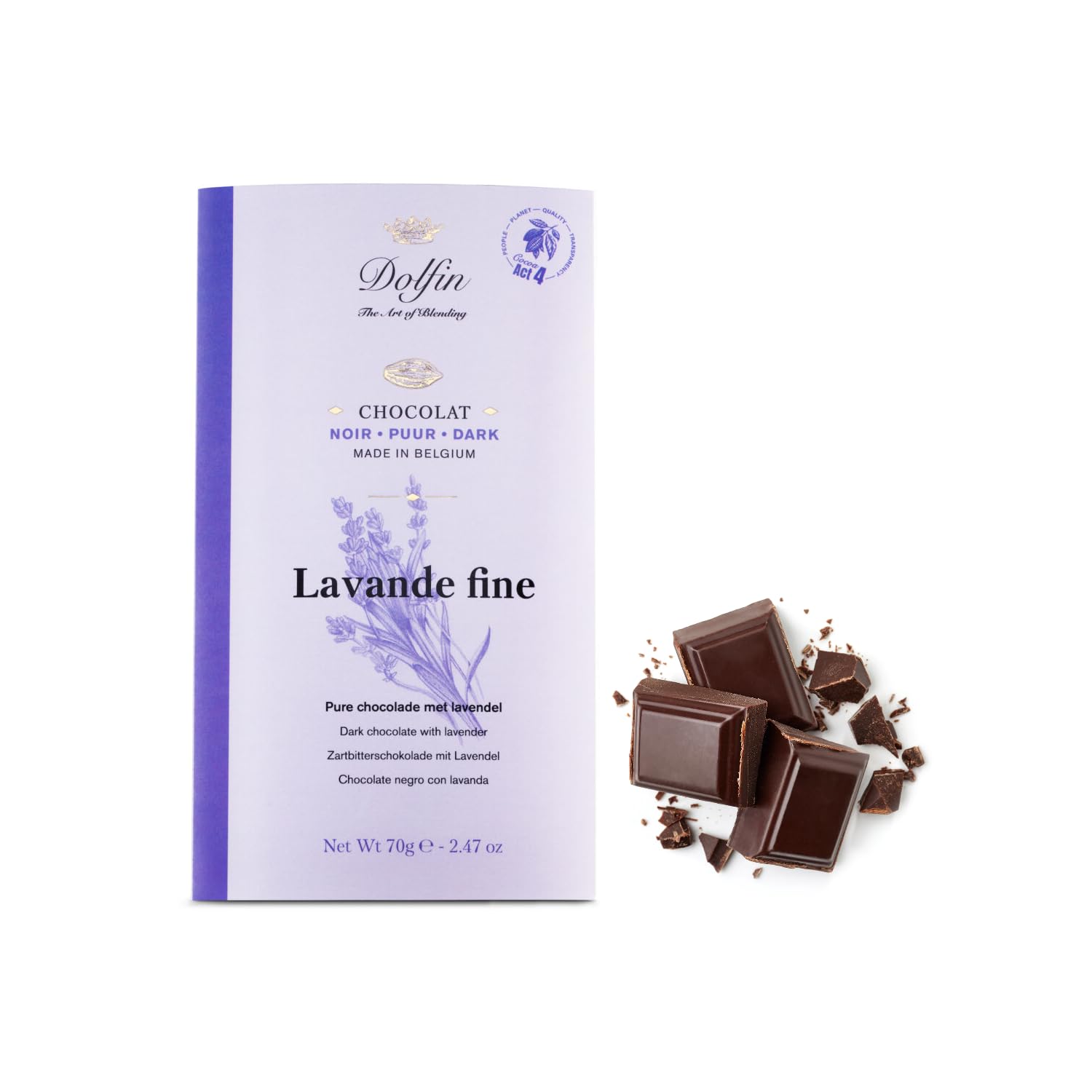 DOLFIN For Dolfin, chocolate is a passion. For decades, Dolfin's philosophy has been to blend high-quality, natural ingredients directly into the chocolate. Fruits, spices, herbs, flowers, and classic ingredients combine in perfect and subtle blends with the finest traditional chocolates. "Fine Lavender": 60 dark chocolate bar with lavender. Made in Belgium. (1 x 70 grams). [SINCE 1989] - Dolfin's philosophy is to blend high-quality, natural ingredients directly into the chocolate. Fruits, spices, flowers, and classic pastries combine subtly and harmoniously with the finest traditional chocolate. [THE RECIPES] - Passionate about travel, the master chocolatiers seek out the best ingredients, selecting them from the very best that nature has to offer. They create surprising combinations for exquisite, well-rounded flavors, with no added sugar or fat. [QUALITY] - Customer satisfaction is our daily goal! At Dolfin, we are committed to providing impeccably fresh chocolates. Our team is attentive to all your needs and dedicated to serving you quickly and professionally! [MISSION] - To offer high-quality, diverse products to meet our customers' expectations, combining pleasure with the creation of delicious and wholesome chocolates, made with pure cocoa butter and ingredients rigorously selected for their quality. [COMPANY] - All Dolfin chocolates and chocolate products are produced exclusively in Belgium, in our workshops located in Baulers. At Dolfin, we are committed to providing you with impeccably fresh chocolates! INGREDIENTS Cocoa mass, sugar, cocoa butter, lavender 1 , emulsifier: soy lecithin, natural vanilla flavoring. Minimum cocoa content: 60 . Contains soy. May contain traces of milk, nuts, gluten, and eggs.Dolfin 60 de chocolat noir et lavande Barre de Cacao 60 Fleurs de Lavande Fines - 1 x 70 GrDESCRIPTION DU PRODUIT DESCRIPTION DU PRODUIT DOLFIN Pour Dolfin, le chocolat est une passion. Depuis des décennies, la philosophie de Dolfin consiste à mélanger des ingrédients naturels de haute qualité directement dans la masse de chocolat. Fruits, épices, herbes, fleurs ou encore les grands classiques s'associent dans des mélanges parfaits et subtils avec les plus beaux chocolats traditionnels. "Lavande Fine" : tablette de chocolat noir noir 60 à la lavande. Fabriqué en Belgique. (1 x 70 grammes). [DEPUIS 1989] - La philosophie de Dolfin est de mélanger des ingrédients naturels de haute qualité directement dans la masse de chocolat. Fruits, épices, fleurs ou grands classiques de la pâtisserie s'associent subtilement et harmonieusement au meilleur chocolat traditionnel. [LES RECETTES] - Passionnés de voyages, les maîtres chocolatiers recherchent les meilleurs ingrédients, qu'ils sélectionnent parmi ce que la nature a de meilleur à offrir. Ils conçoivent des associations surprenantes pour des saveurs exquises et rondes, sans sucres ni graisses ajoutés. [QUALITÉ] - Satisfaire le client est l'envie quotidienne ! Chez Dolfin nous nous engageons à fournir des chocolats d'une fraîcheur irréprochable. Notre équipe est à l'écoute de tous vos besoins et s'engage à vous servir rapidement et professionnellement ! [LA MISSION] - Proposer des produits de qualité et diversifiés pour répondre aux attentes de nos clients, alliant plaisir et assurant l'élaboration de chocolats savoureux et sains, à base de pur beurre de cacao et d'ingrédients rigoureusement sélectionnés pour leur qualité. [ENTREPRISE] - Tous les chocolats et articles en chocolat Dolfin sont produits exclusivement en Belgique, dans des laboratoires situés à Baulers. Chez Dolfin, nous nous engageons à vous fournir des chocolats impeccablement frais ! INGRÉDIENTS Pâte de cacao, sucre, beurre de cacao, lavande 1 , émulsifiant: lécithine de soja, arôme naturel de vanille. Cacao minimum: 60 . Contient du soja. Il peut contenir des traces de lait, de fruits à coque, de gluten et d'œufs.