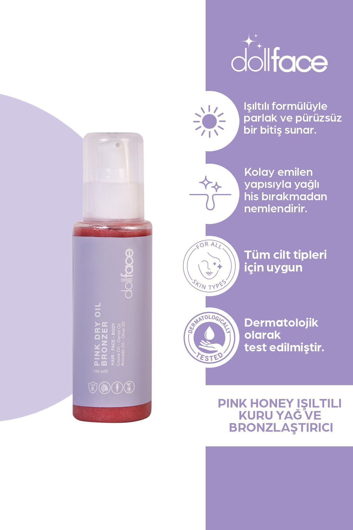 • Dollface Pink Honey Radiant Dry Oil is enriched with natural nutrients while adding shine and tan to your skin. Cocoa butter deeply moisturizes and softens your skin Carrot oil nourishes your skin with vitamin A and beta-carotene. Avocado oil gives your skin elasticity with its vitamins and fatty acids, and olive oil provides protection with its antioxidant effect. With its light and fast-absorbing formula, it does not leave a sticky feeling after application. This oil, which increases the natural glow of your skin, provides a perfect tan while enjoying the sun. Suitable for all skin types, this product is the ideal choice for your summer holidays.