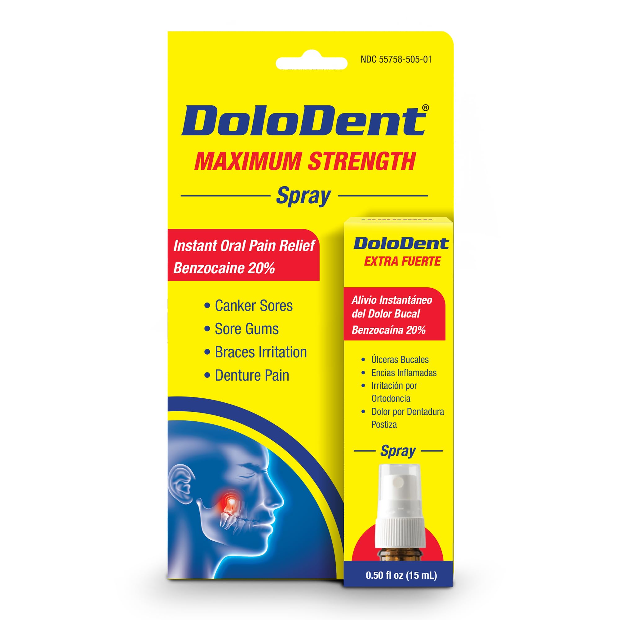 DOLODENT Maximum Strength Oral Pain Relief Spray, 0.5 fl oz - 20% Benzocaine Mouth Spray - Fast Pain Relief for Mouth Sores, Sore Gums, Braces & Denture Irritation