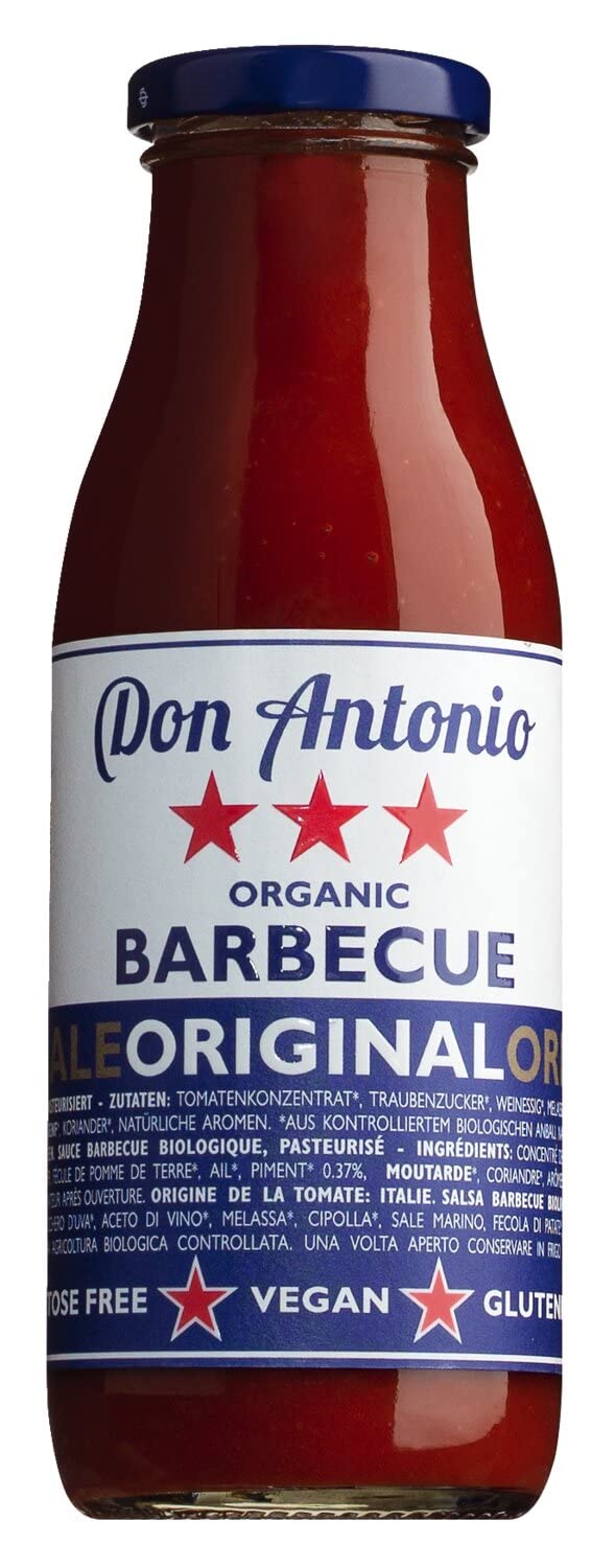 BBQ sauce is a flavorful and versatile seasoning sauce that pairs perfectly with grilled meats, vegetables, and other treats. Unlike the American version, Italian BBQ sauce is a bit lighter and fruitier in taste. It is made from sun-ripened tomatoes, seasoned with an aromatic blend of cilantro, chili pepper, garlic, and other herbs. The Italian tomatoes used for the sauce are of the highest quality and are grown by experienced farmers in the sunny fields of Italy. They are carefully harvested and processed immediately after picking to preserve their rich aroma and vibrant color. The blend of spices used in the BBQ sauce gives it a unique and distinctive flavor. The cilantro provides a fresh, slightly citrusy note, while the tang of the chili pepper gives the sauce a pleasant kick. The garlic adds an extra flavor note, and the herbs give the sauce aromatic complexity. Overall, Italian barbecue sauce is a fruity and spicy treat that retains its distinctive flavor thanks to the combination of sun-ripened tomatoes and an exquisite blend of spices. Try it and let yourself be seduced by its unique aroma! INGREDIENTS Tomato paste, glucose, wine vinegar, molasses, onion, sea salt, potato starch, garlic, chili pepper 0.37 , mustard, coriander, natural spice flavoring, natural pine flavoringDon Antonio - Sauce barbecue bio, 350 ml, sauce assaisonnée savoureuse et polyvalente, assaisonnée d'un mélange aromatique de coriandre, de piment, d'ail et d'autres herbes, plaisir fruité et épicéDESCRIPTION DU PRODUIT DESCRIPTION DU PRODUIT La sauce barbecue est une sauce aromatisante savoureuse et polyvalente qui se marie parfaitement avec la viande grillée, les légumes et autres friandises. Contrairement à la version américaine, la sauce barbecue italienne est un peu plus légère et fruitée au goût. Il est fabriqué à partir de tomates mûres au soleil, assaisonnées d'un mélange aromatique de coriandre, de piment, d'ail et d'autres herbes. Les tomates italiennes utilisées pour la sauce sont de la plus haute qualité et sont cultivées par des agriculteurs expérimentés dans les champs ensoleillés en Italie. Ils sont soigneusement récoltés et traités immédiatement après la récolte pour préserver leur arôme riche et leur couleur vive. Le mélange d'épices utilisé dans la sauce barbecue lui confère un arôme unique et distinctif. La coriandre donne une note fraîche et légèrement agrumes, tandis que la netteté du piment donne à la sauce un coup de pied agréable. L'ail apporte une note gustative supplémentaire et les herbes donnent à la sauce une complexité aromatique. Dans l'ensemble, la sauce barbecue italienne est un régal fruité et épicé qui conserve son goût distinctif grâce à la combinaison de tomates mûres au soleil et d'un mélange d'épices exquis. Essayez-les et laissez-vous séduire par leur arôme unique ! INGRÉDIENTS pâte de tomate, glucose, vinaigre de vin, mélasse, oignon, sel de mer, amidon de pomme de terre, ail, piment 0,37 , moutarde, coriandre, arôme d'épices naturelles, arôme naturel de pin