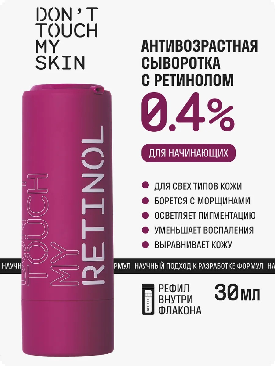 Packaging with a dispenser and refill capsule is economical and environmentally friendly. The bottle Dont Touch My Skin is reusable; simply replace the inner capsule: 396022625. Apply a small amount of serum at night to the skin of the face and neck - after cleansing and before your main skincare routine. If you are using retinol for the first time, start with twice a week and gradually increase the frequency of applications.